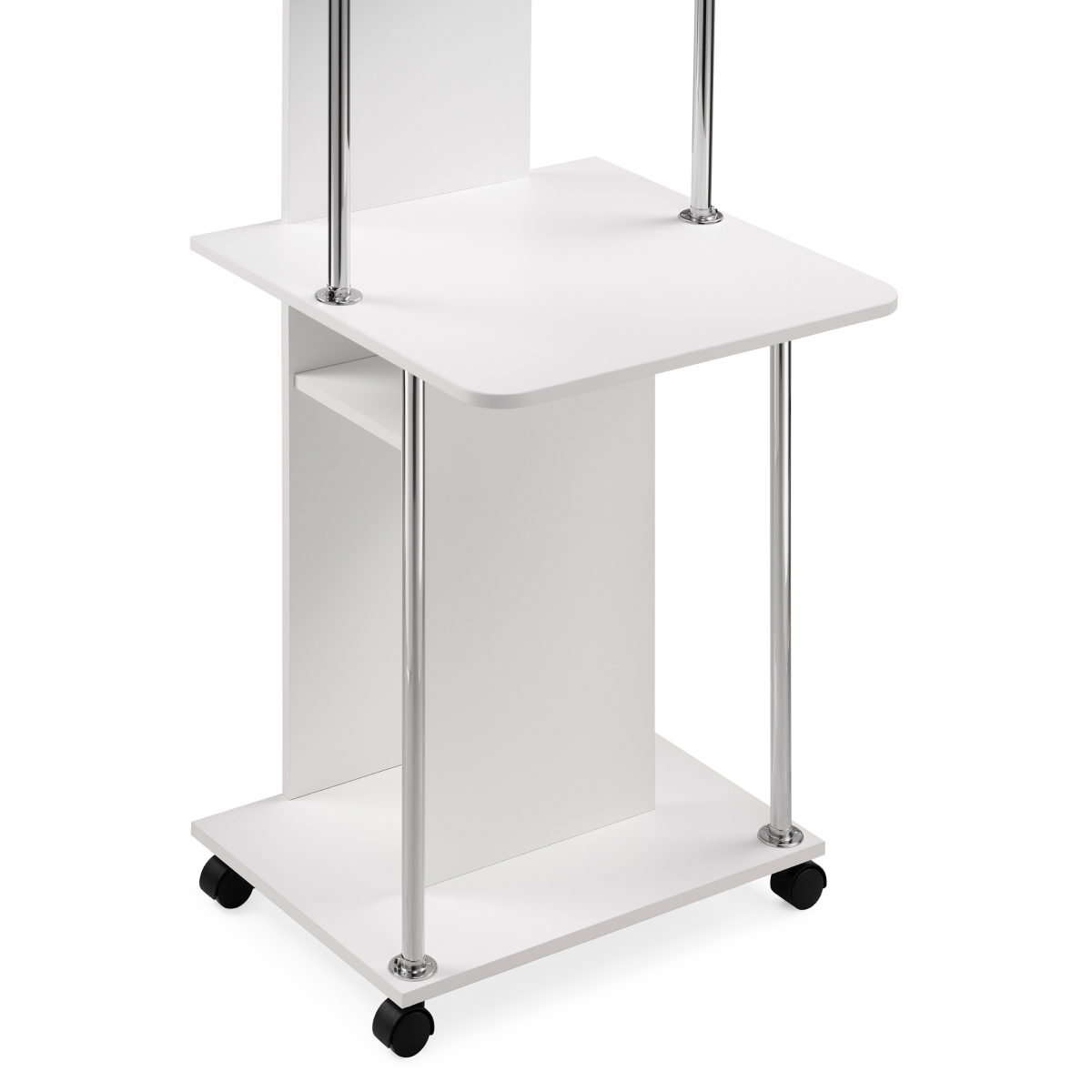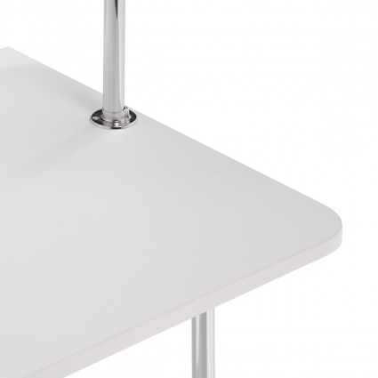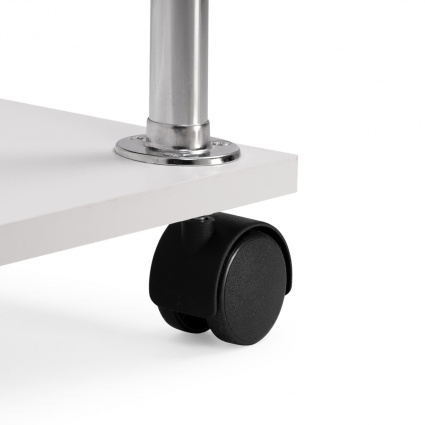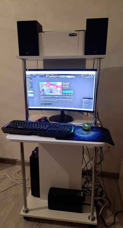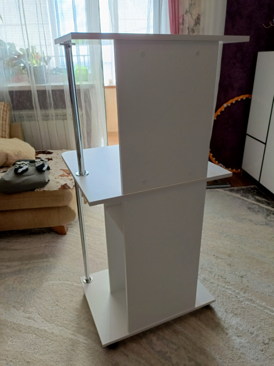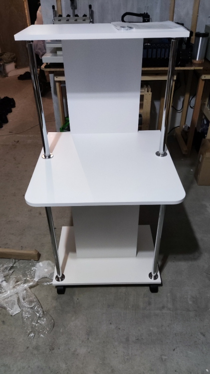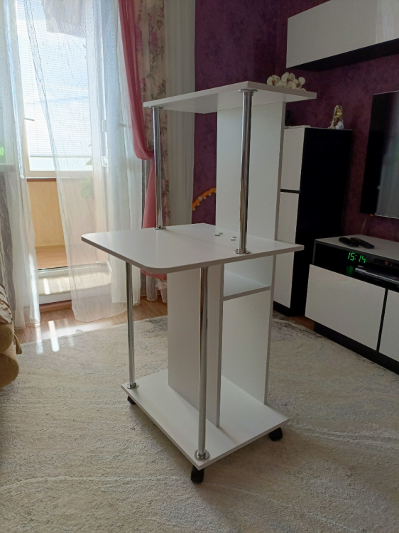 Оригинальный компьютерный стол на колесиках. За таким столом Вы можете работать как с ноутбуком, так и за стационарным компьютером. За центральной стойкой предусмотрено место для системного блока.Высота от столешницы до верхней полочки — 476 мм. Высота от полочки над системным блоком до столешницы — 166 мм. Высота проема под системный блок — 500 мм, ширина проема — 238 мм. Проем под монитор позволяет разместить экран с диагональю до 20".Изделие выполнено из ЛДСП толщиной 16 мм, края обработаны кромкой ПВХ 2 и 0,4 мм.Стол очень нравится, долго выбирала, рассматривала варианты, т.к. у нас студия основные критерии - компактность и мобильность. Стол идеально вписался в интерьер, белый, стильный, места занимает очень мало, колёсики надёжные и подвижные. Был хорошо упакован, понятная инструкция, собирала сама, впервый раз. Доставлен без сколов, гладкая, приятная поверхность. высота верхней полки 30 см . идеально подойдет для монитора, сетевого блока, и принтера, у нас стоит ноут и колонка. Единственный минус - пришлось отрезать 1 см от нижних металлических опор, т.к столешницу невозможно было установить. но это не сложно. Из-за этого поставила 4 звезды вообщем стол советую, классный , удобный; Достоинства: стильный, компактный, мобильный,удобный; Недостатки: нижние металические опоры пришлось отрезать, т.к. они были на 1 см длиннее чем необходимо. но это не сложно и на качество ни как не повлияло