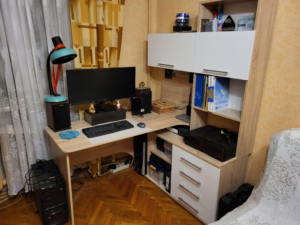 Купили КСТ-14П компьютерный стол, цвет беленый дуб/венге. Очень компактный аккуратный, стильный. Долго искала и остановилась на этой модели, что есть место для принтера. Полку не стали ставить вторую над принтером. Хорошее пространство для кресла. Единственное, 2минуса, на нависную полку, ближе к углу можно было ее усилить, а внизу сделать дверцу на нижние полки. Попали в акцию за 12700р. Доставка была вовремя, на все вопросы ответил менеджер Артем, очень компетентный сотрудник. Спасибо за Сборку Марату. Всем рекомендую Лайфмебель!