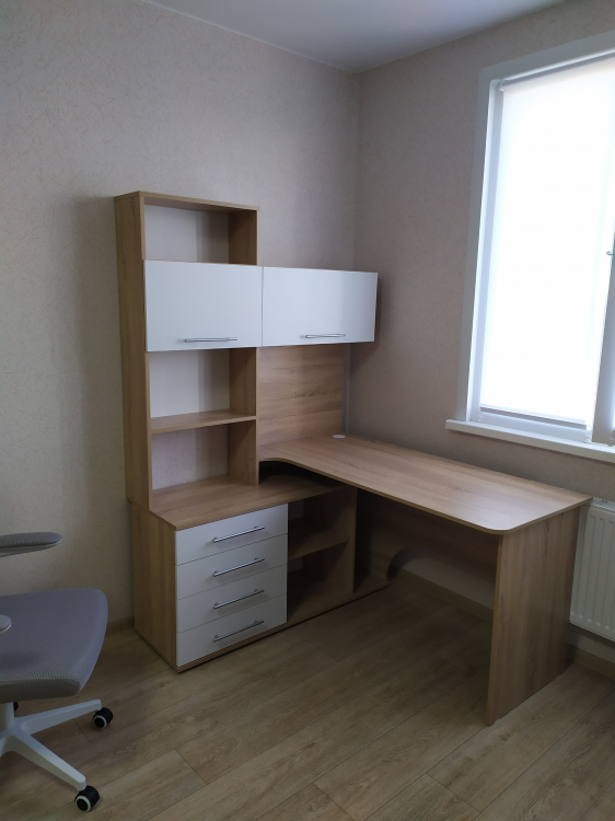 Многофункциональный рабочий модуль для домашнего кабинета или офиса. Модель сочетает в себе широкий компьютерный стол с размером столешницы 140 см, тумбу с ящиками, полками и нишей под системный блок. Высокая надстройка имеет открытые полки и два закрытых шкафа. Двери шкафчиков открываются вверх. Внутренний размер ящиков — 45,6 х 34,6 см.Такая модель компьютерного стола позволяет организовать максимально удобную и функциональную рабочую зону.Изделие выполняется из ЛДСП толщиной 16 мм, края обработаны кромкой ПВХ 0,4 и 2 мм. Задняя стенка — ДВП серого цвета. Ручки-рейлинги выполнены из металла. Расстояние между креплениями ручек — 192 мм.Купили КСТ-14П компьютерный стол, цвет беленый дуб/венге. Очень компактный аккуратный, стильный. Долго искала и остановилась на этой модели, что есть место для принтера. Полку не стали ставить вторую над принтером. Хорошее пространство для кресла. Единственное, 2минуса, на нависную полку, ближе к углу можно было ее усилить, а внизу сделать дверцу на нижние полки. Попали в акцию за 12700р. Доставка была вовремя, на все вопросы ответил менеджер Артем, очень компетентный сотрудник. Спасибо за Сборку Марату. Всем рекомендую Лайфмебель!