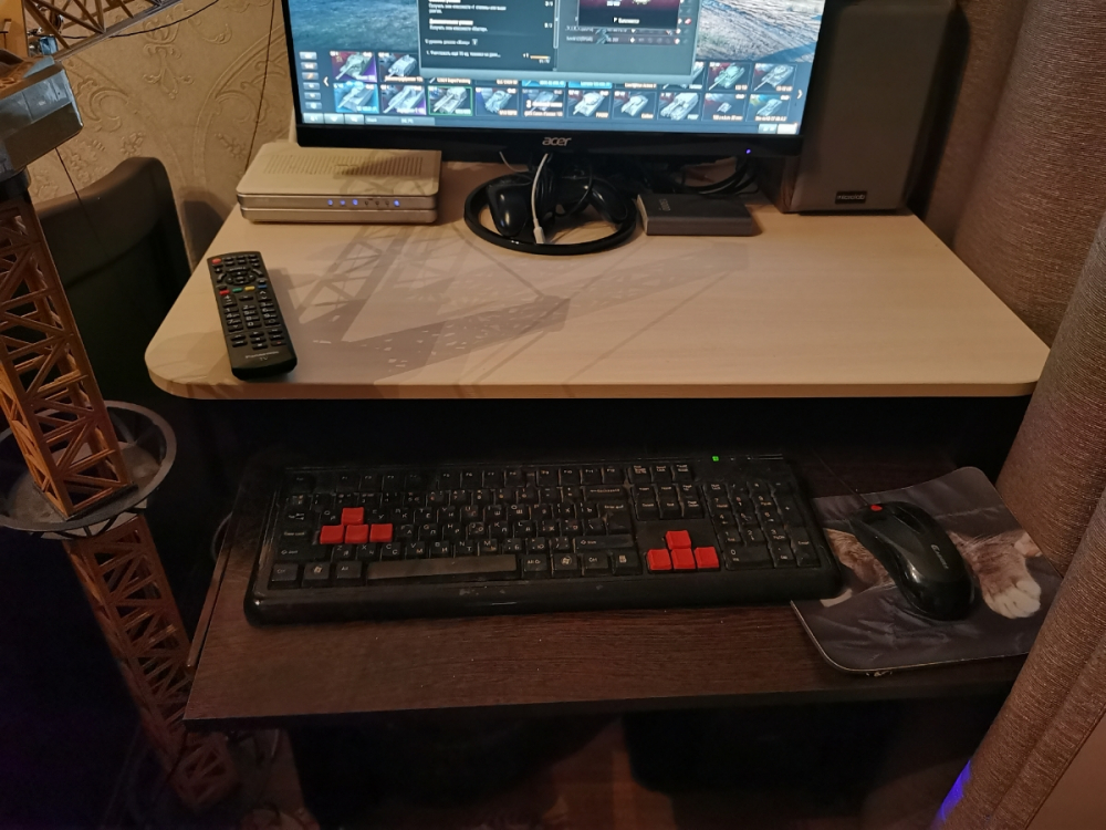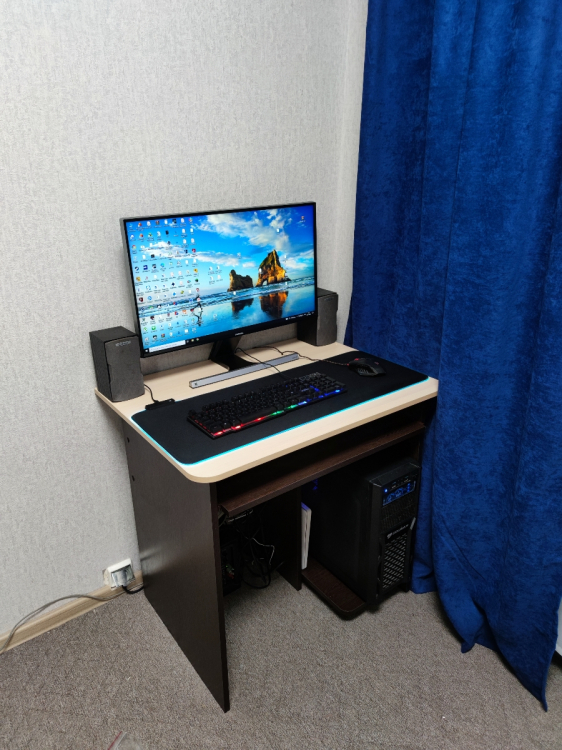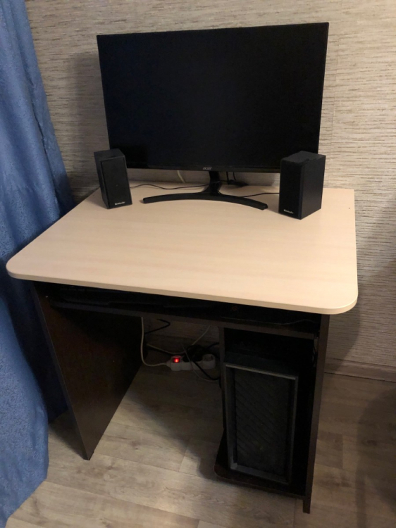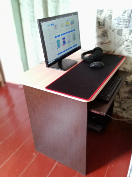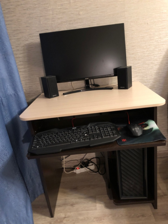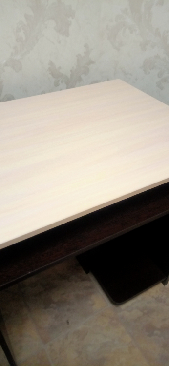 Хороший , аккуратный стол ) я бы сказала компактный, всё входит и кружка с кофе и клавиатура , но места занимает не много) комплектующие в целости и сохранности. Ни сколов ни царапин на стенках. Пользуемся уже два месяца - Остались очень довольны покупкой .; Достоинства: цена качество - прекрасно ) на этом цвете не очень пыль заметна; Недостатки: нет