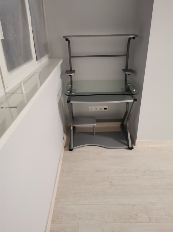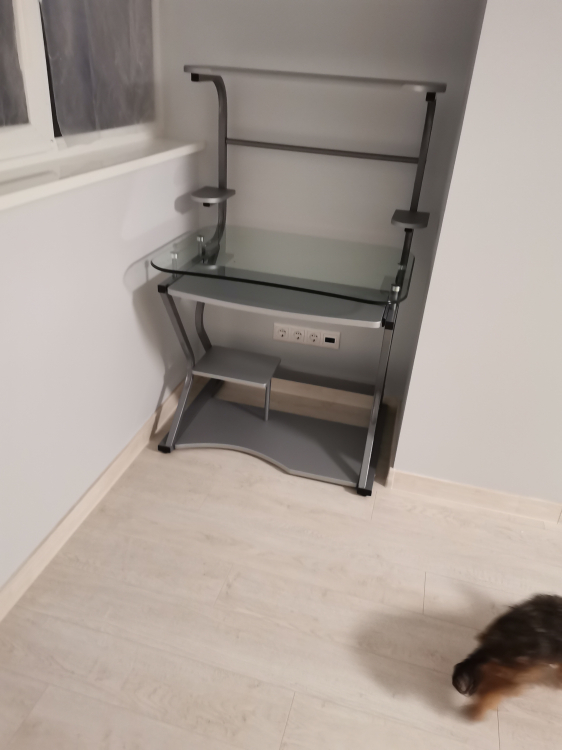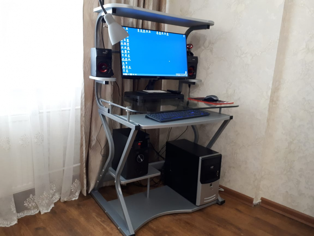 Стол идеально вписался в малогабаритную квартиру.Столешница стеклянная,стекло качественное,стойки металлические,полка,подставка под колонки и выдвижная панель под клавиатуру из дсп.,высота и ширина изделия соответствует заявленным параметрам.Доставка осуществилась по договоренности.В общем покупкой довольны.
