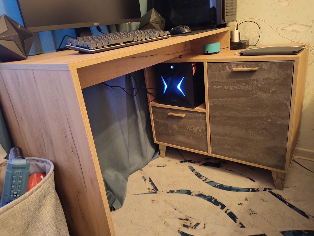 Хороший стол, отлично подошёл для маленькой комнаты. Можно расположить как прямо, так и углом, вместительные полочки. Приятный цвет, дверцы под камень. Из минусов: нет отверстий, чтоб выдвинуть тумбу чуть дальше, тем самым освободить место для ног.; Достоинства: вместительный; Недостатки: в комментарии