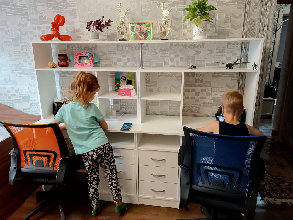 Стол выполнен из ЛДСП толщиной 16 мм, края обработаны кромкой ПВХ 0,4 мм.Получив посылку, подумали "как де мы это соберём?" Но наделе все рказалось проще. Начали, сами того не зная, с самого сложного-тумб с ящиками. Когда увилели роллы, охватила паника, как де мы это все ровно отмерием. Но доя всех гврздмков-шурупчиков есть отверстия и разметка куда, что должно входить. Поэтому сбор получился достаточно оегким, даже дети участвовали. Стол хороший, детям их рабочие места понравились