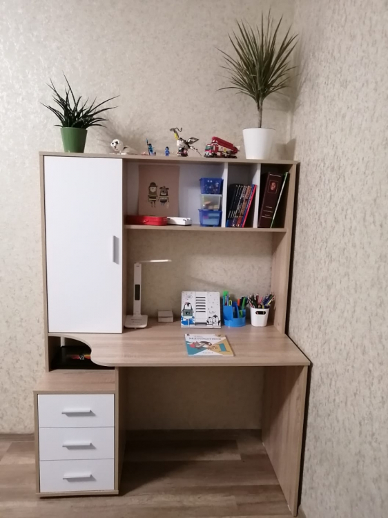 Отличный,недорогой и компактный стол .Сборка простая и понятная по инструкции.Собирали самостоятельно.Сделано все добротно.Детали подогнаны идеально.Упаковано было все очень хорошо,так что продавец большой молодец!; Достоинства: красивый,компактный; Недостатки: Не хватает задней стенки по центру ,где сама столешница.Туда можно было бы повесить расписание уроков.