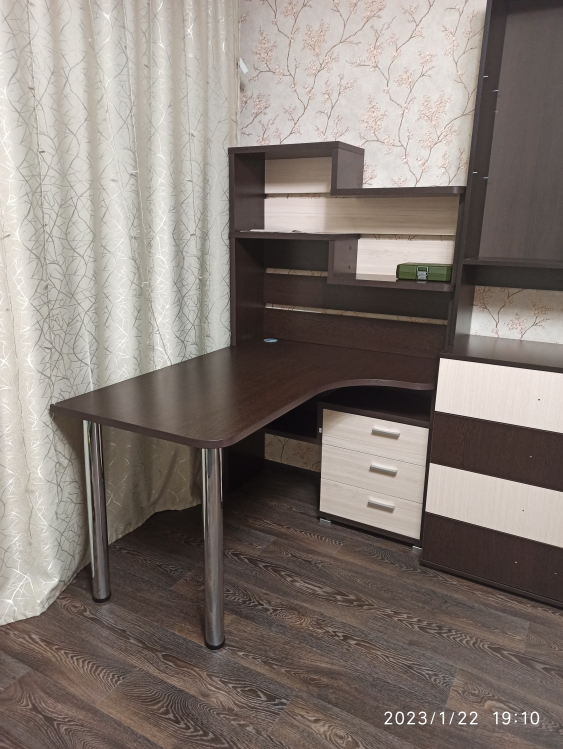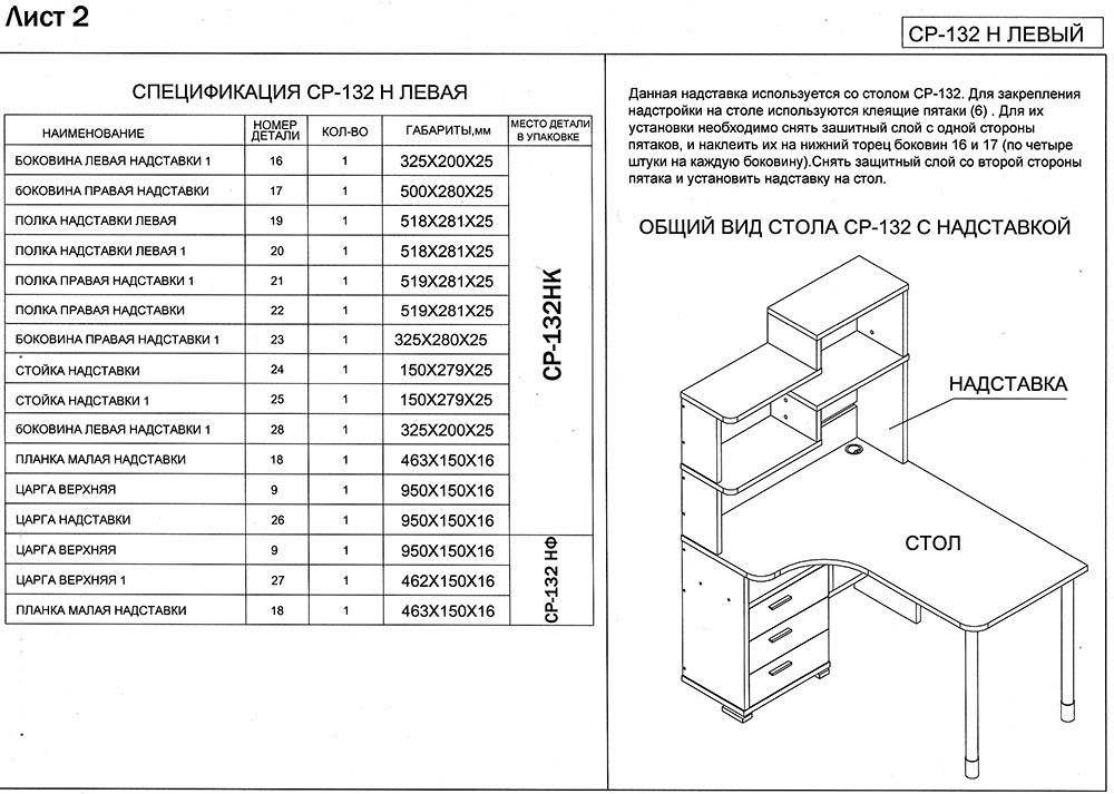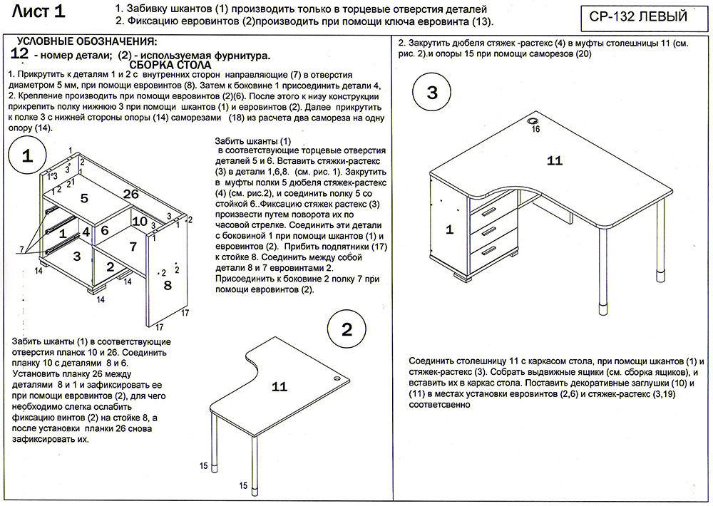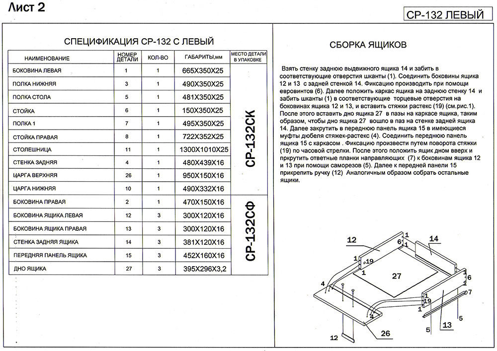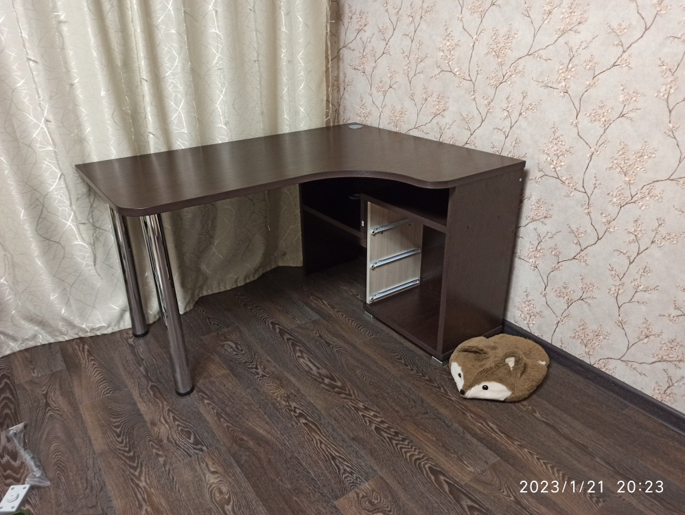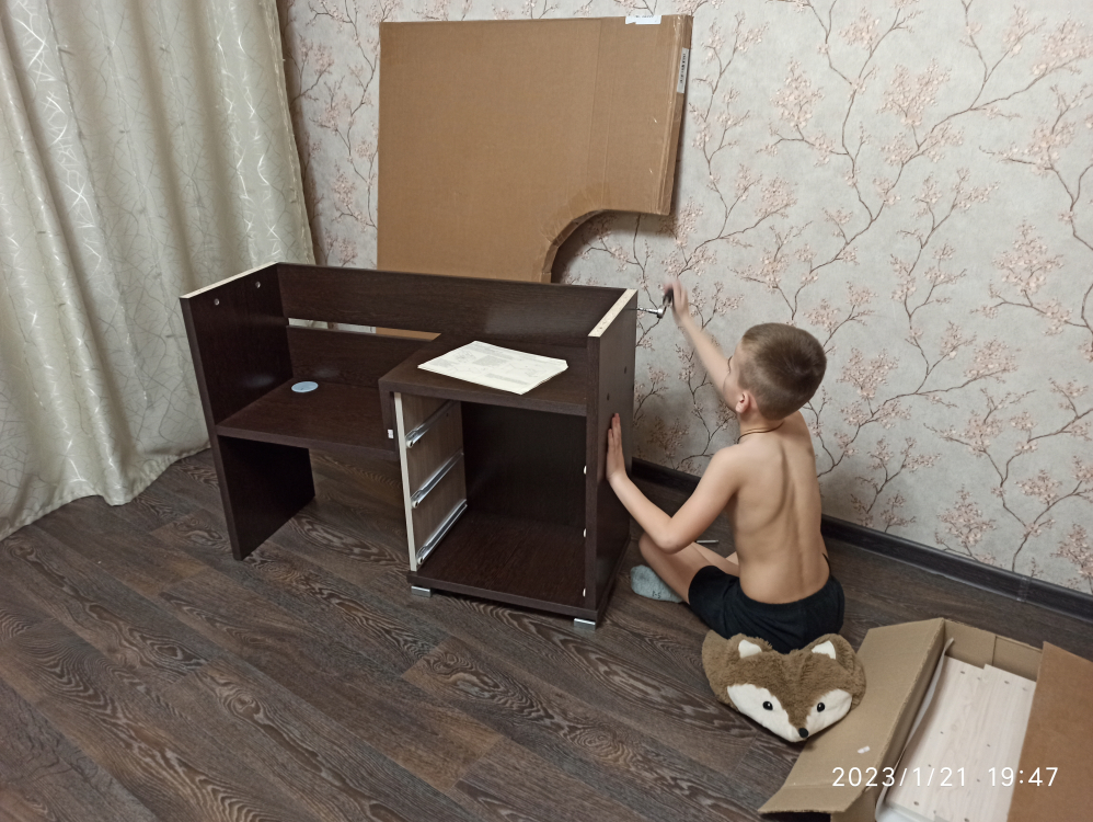 Используется плита ДСП толщиной 25 мм.Качественная упаковка. Все панели переложены бумагой, чтобы не царапались. Детали пронумерованы, что очень удобно. Столешница толстая, не прогибается. Ящички не большие. Что не понравилось: ножки стола длинные и не достаточно фиксируют столешницу от колебаний. Полка справа высокая, а крепится к столешнице двусторонним скотчем! Удивили. Надо бы крепление понадежней придумать.