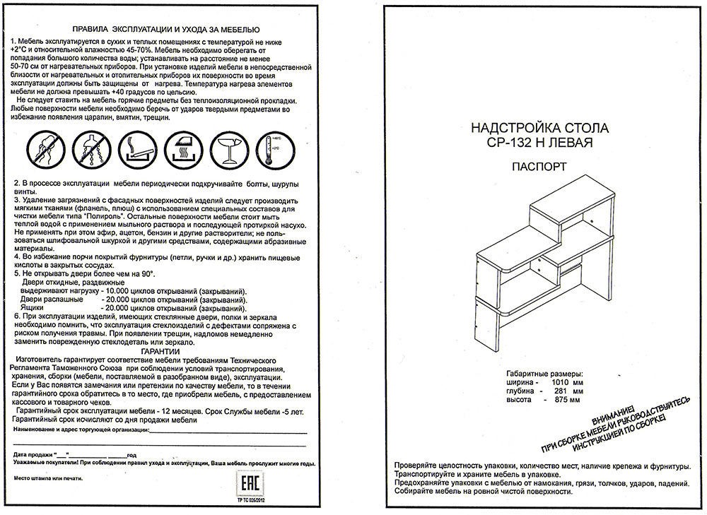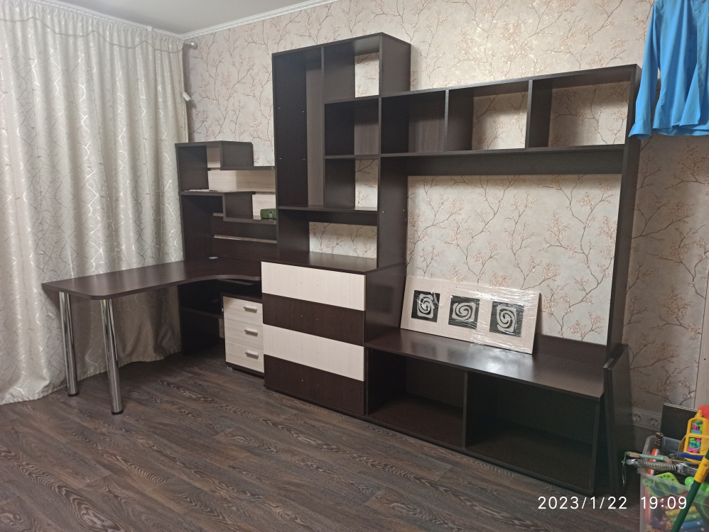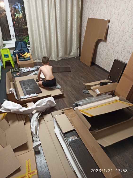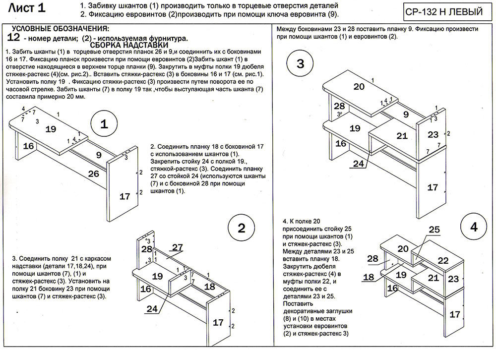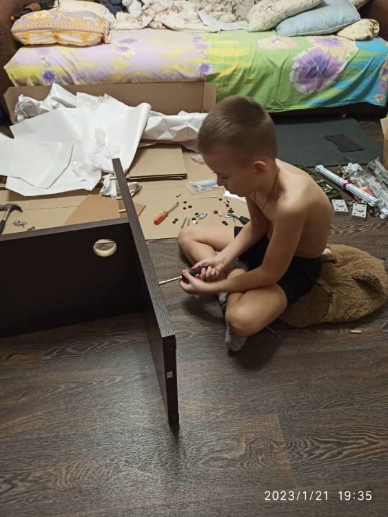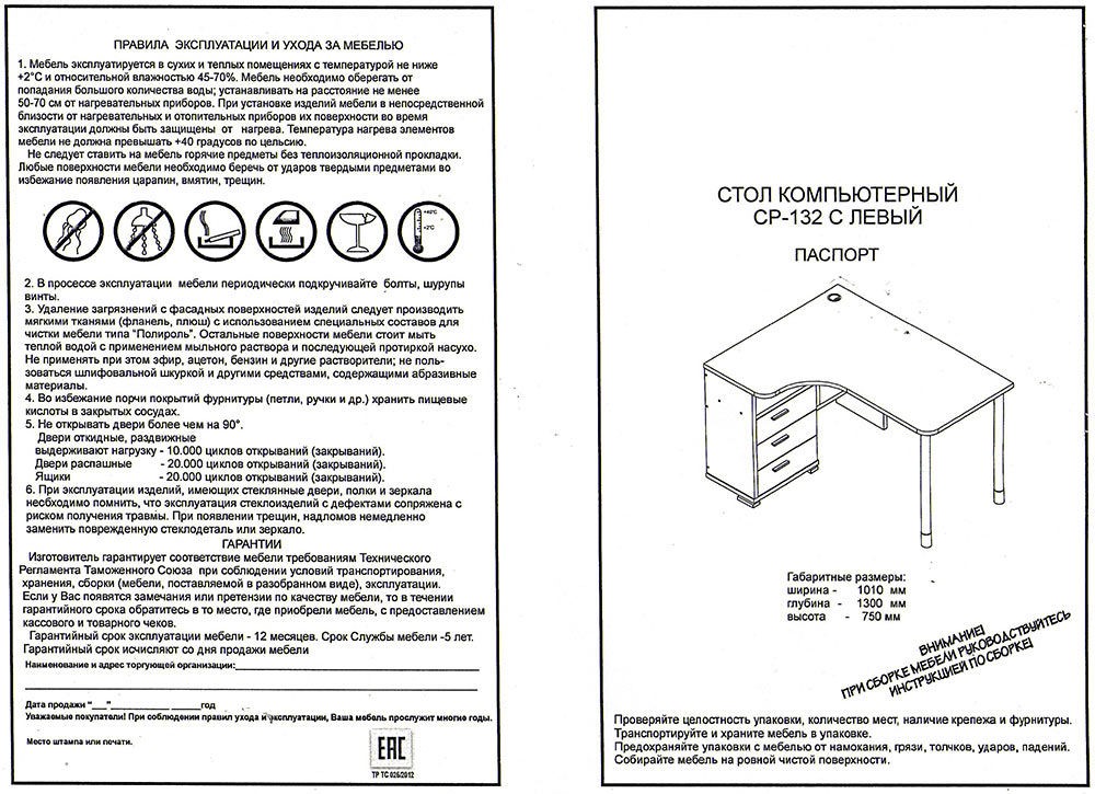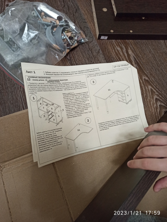 Используется плита ДСП толщиной 25 мм.Качественная упаковка. Все панели переложены бумагой, чтобы не царапались. Детали пронумерованы, что очень удобно. Столешница толстая, не прогибается. Ящички не большие. Что не понравилось: ножки стола длинные и не достаточно фиксируют столешницу от колебаний. Полка справа высокая, а крепится к столешнице двусторонним скотчем! Удивили. Надо бы крепление понадежней придумать.