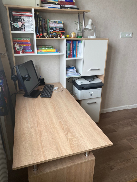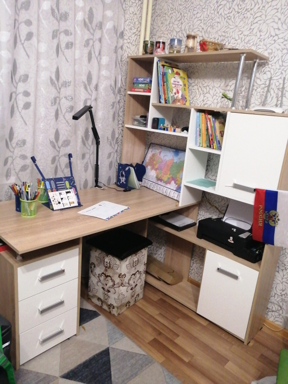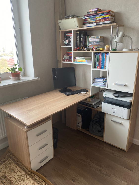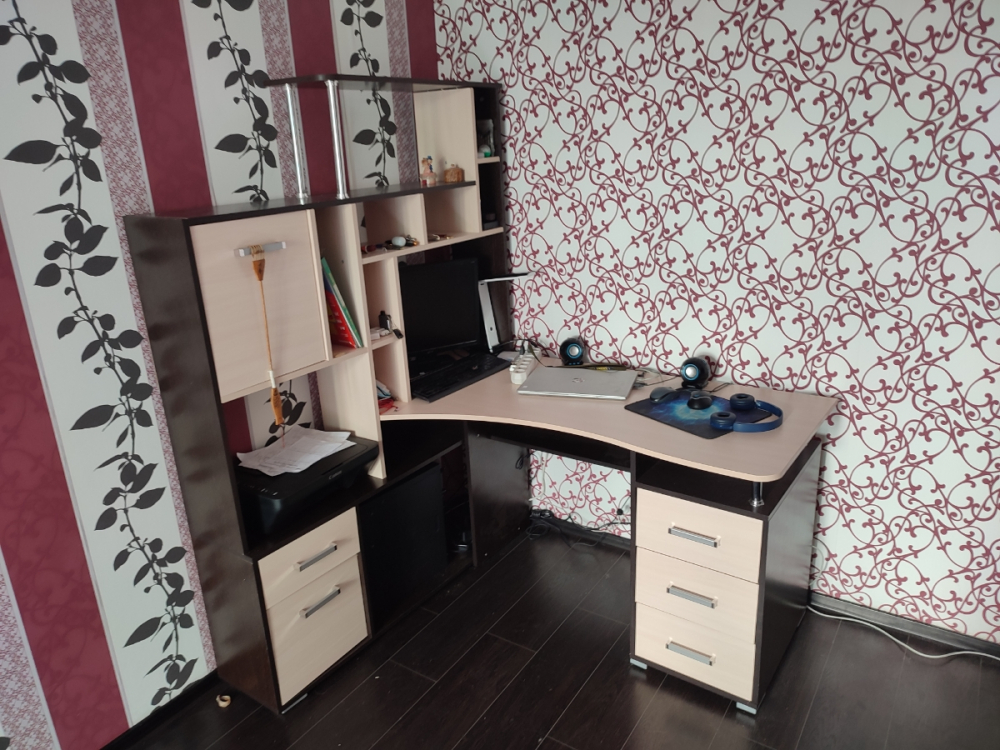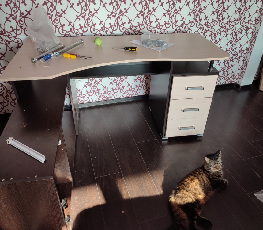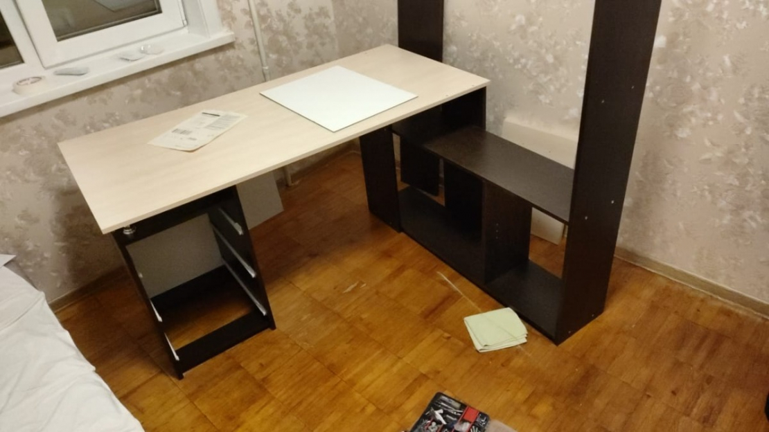 Края покрыты противоударной кромкой ПВХ 1 мм.Ящики на роликовых направляющих.Славный дизайн, вписывается в, общем-то, в любой рабочий интерьер. Нет выдвижной подставки под клавиатуру - но не всем она нужна, да и пошёл - купил. Нужно правильное кресло.; Достоинства: Очень интересный для сборки экземпляр! И для жизни за столом (программистская удалёнка) весьма подходит. Удобно, рядом все мелочи, да и место под МФУ задумано. Правильные размеры. Все края и углы хорошо просчитаны и совпадают с ответными. Лёгкий! И на мягких ножках.; Недостатки: Прекрасно помогли бы отверстия для проводов.