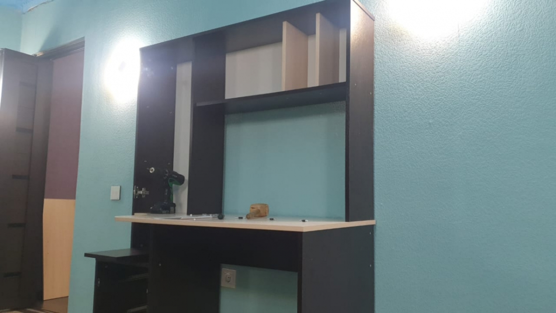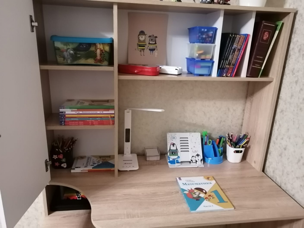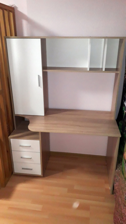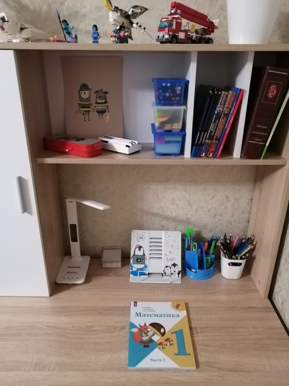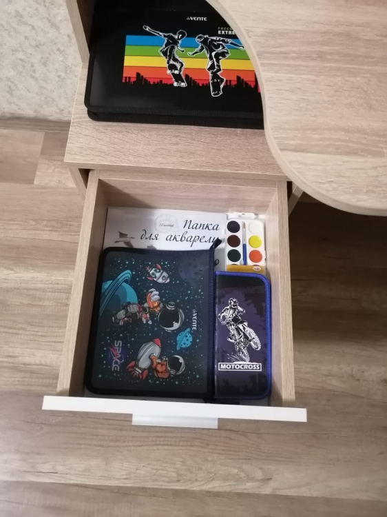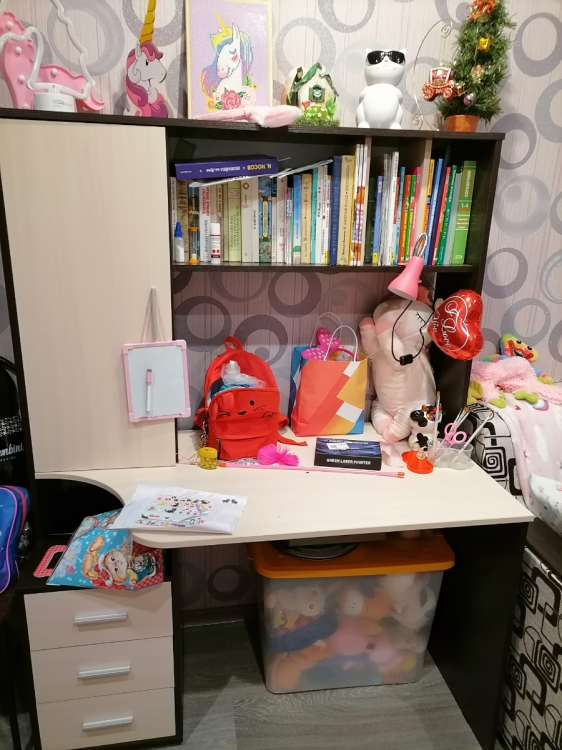 Отличный,недорогой и компактный стол .Сборка простая и понятная по инструкции.Собирали самостоятельно.Сделано все добротно.Детали подогнаны идеально.Упаковано было все очень хорошо,так что продавец большой молодец!; Достоинства: красивый,компактный; Недостатки: Не хватает задней стенки по центру ,где сама столешница.Туда можно было бы повесить расписание уроков.
