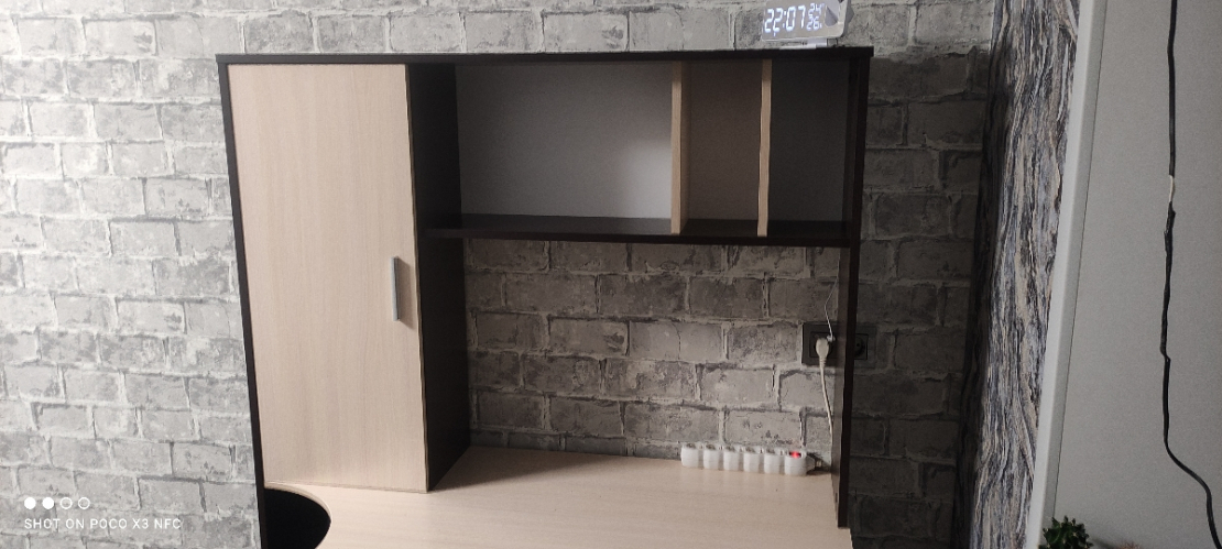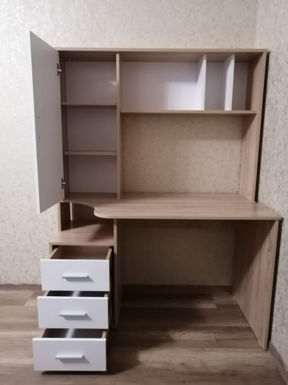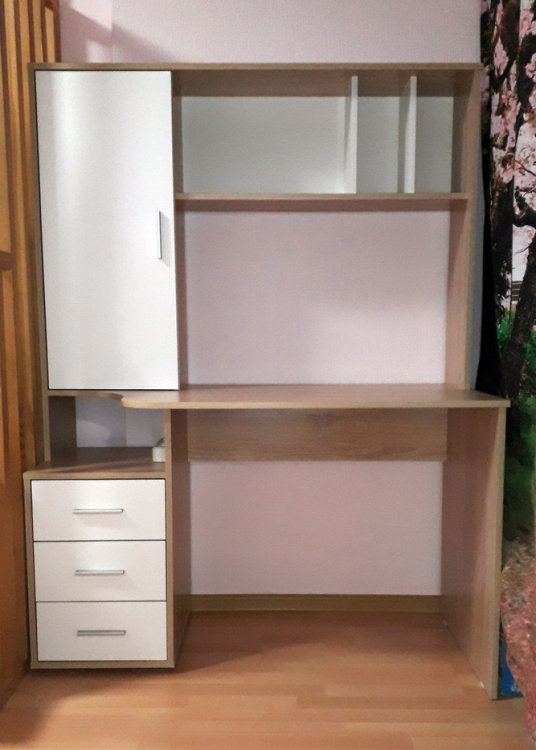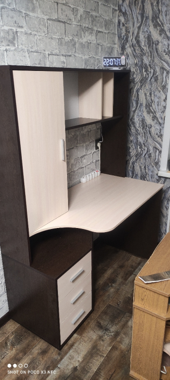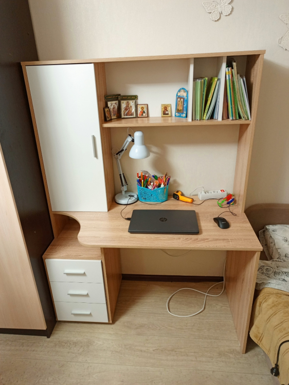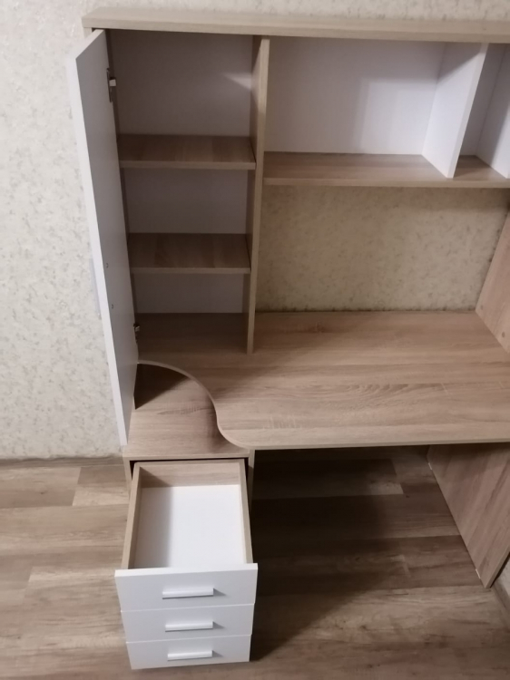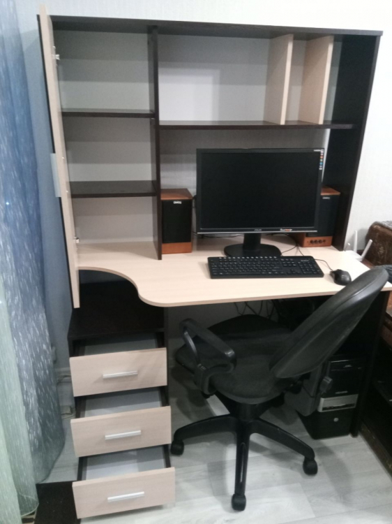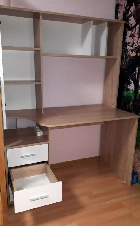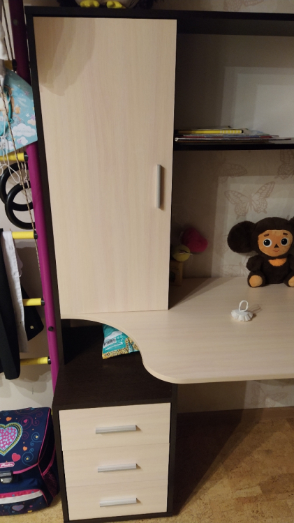 Хорошее изделие, функциональное и красивое. Кроме нашей расцветки есть и просто вся светлая, то есть на любой вкус. Со сборкой проблем не возникло: везде намечены отверстия для саморезов, все совпали.; Достоинства: Хорошая цена, дешевле аналогов, понятная инструкция по сборке, светлая столешница! Лучше смотрится, чем темная: у сына аналогичная гамма у стола, только столешница темная, так у него похуже сидеть. А, еще хорошие шарниры на выдвижных ящиках, не самые дешевые и ломающиеся, а на подшипниках и выдвигаются полностью.; Недостатки: Долгая доставка, но оно того стоило! Все привезли в целости.