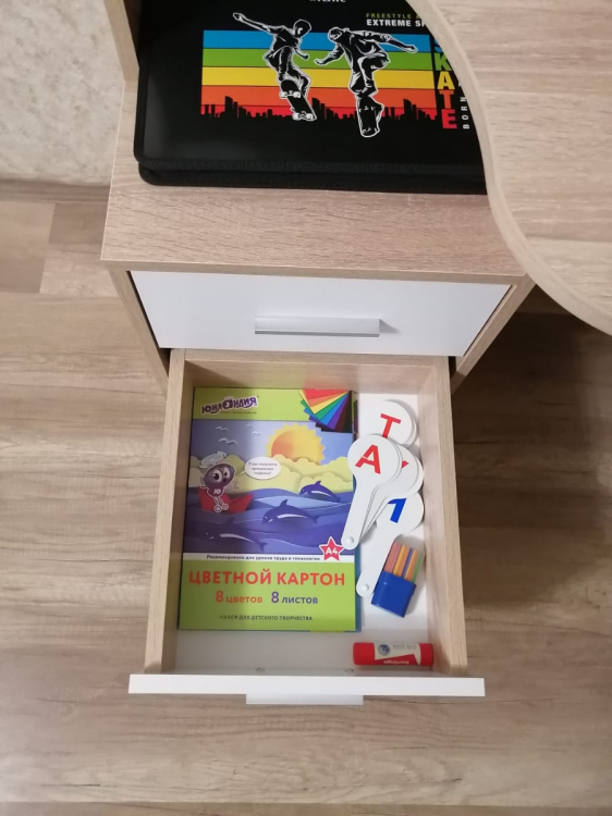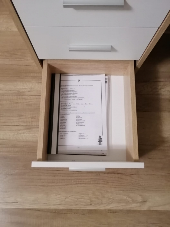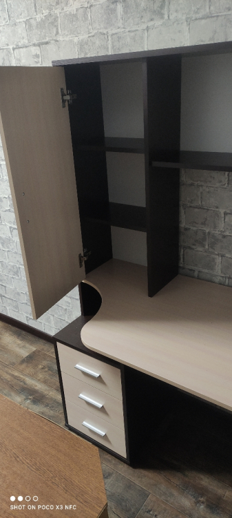 Недорогой, но хороший вместительный стол с ящиками и закрытыми полками.; Достоинства: Неплохой стол в соотношении цена-качество, вместительный, все отверстия на нужных местах, собирается просто, вся фурнитура в комплекте (даже есть пара запасных элементов, мелочь, но очень приятно). Скруглённая столешница, что хорошо для школьника.; Недостатки: Блеклая инструкция (распечатывайте с сайта производителя), некоторые технологические косяки в нахождении отверстий (можно сделать по-другому и упростить сборку) и в последовательности сборки по инструкции. Цвет темнее, чем представлен на сайте производителя/продавца.
