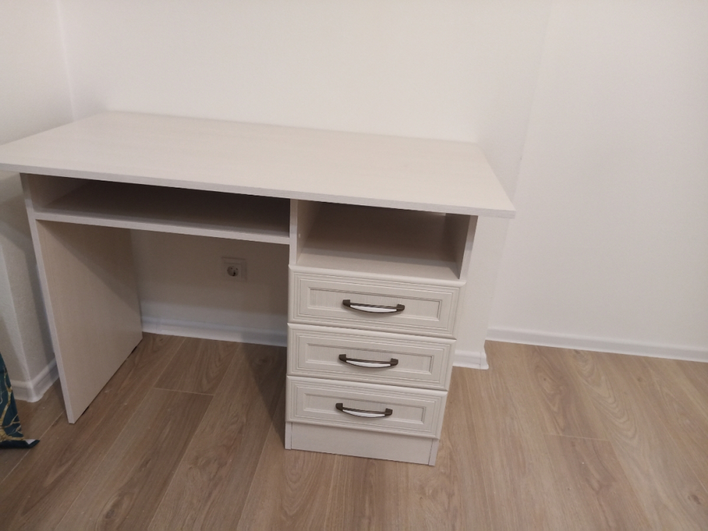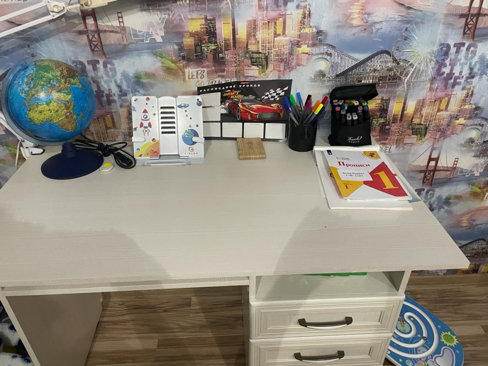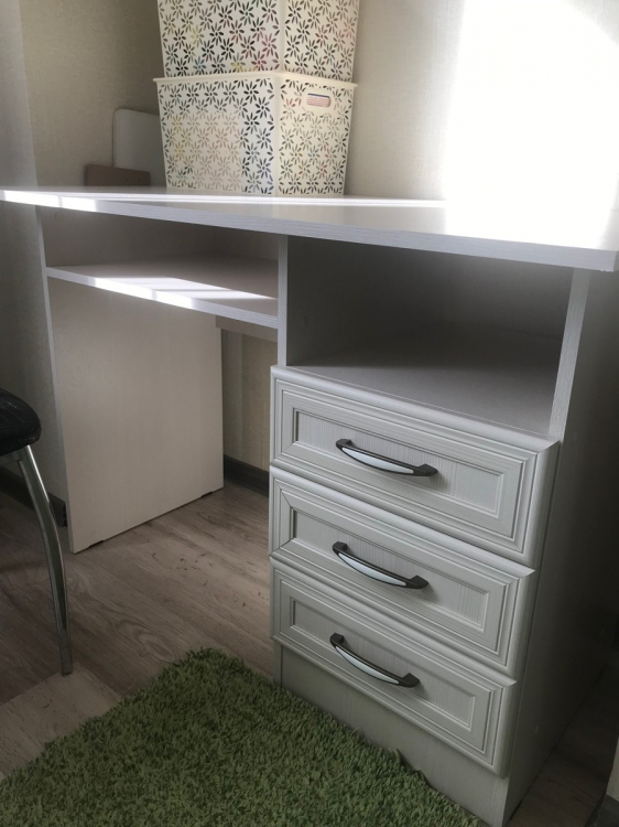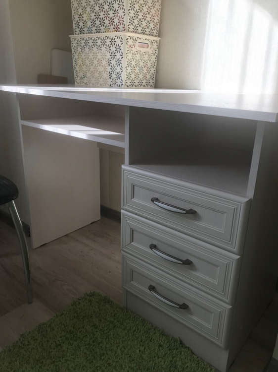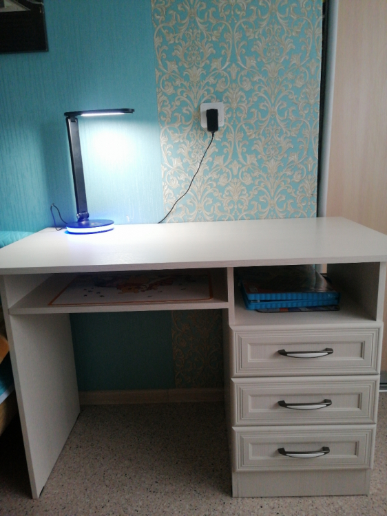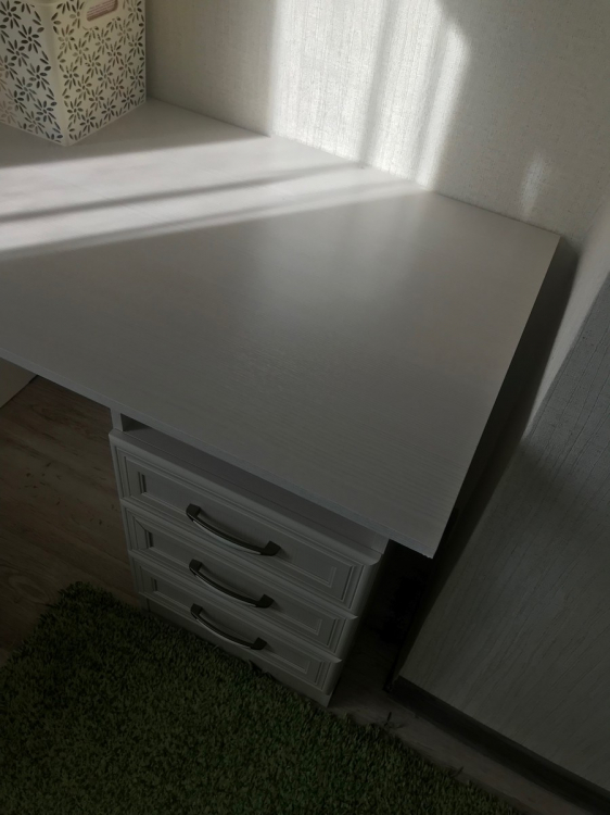 Стол отличный, красивый. Качество достойное. Фурнитура в целом хорошая. Стол отлично вписался в интерьер. Вся детская комната укомплектована мебелью данного производителя. Нареканий нет. Единственный недочёт, это то, что нет разметки для направляющих в шкафчиках. Это заняло чуть больше времени в сборке.; Достоинства: Цена, качество; Недостатки: Нет разметки для направляющих