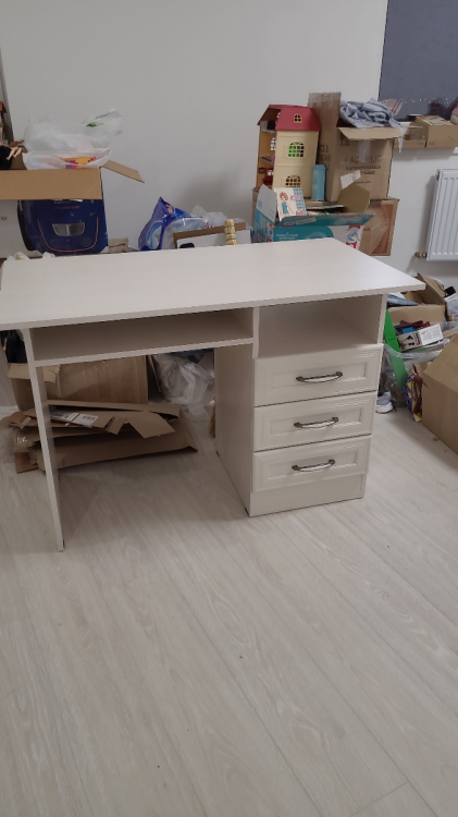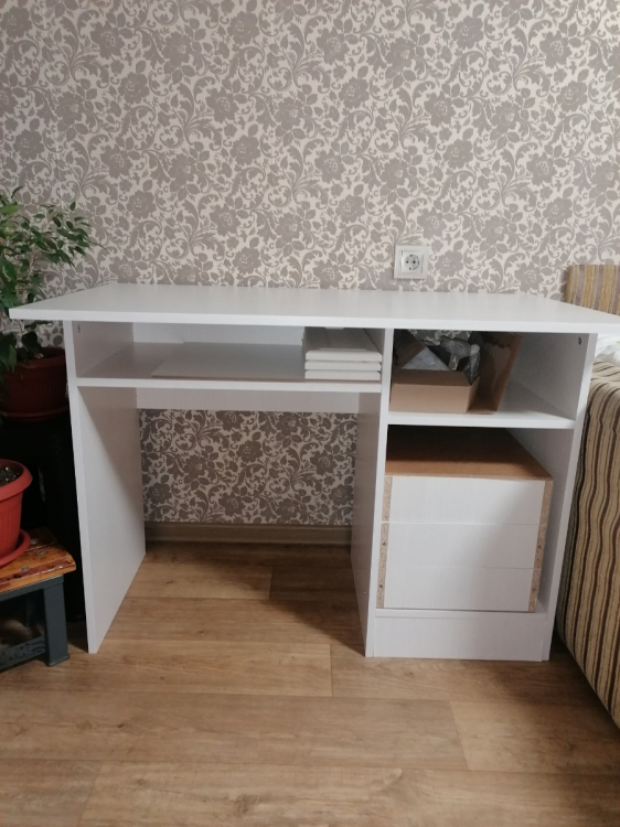 Стол приехал аккуратно упакованный, без сколов, курьер поднял на этаж. Доставка платная, но коробка действительно, тяжелая была. вместе с доставкой получился 6 тр. Интересный цвет. Жаль, инструкция не очень понятная, но опыт сборки у меня был, поэтому в итоге собрала. Разметка для направляющих для ящиков была только на стеночках и то, отверстия не совпадали. Ящики тоже собираются не очень удачно, сторона держится только на одном евровинте. Можно было бы просверлить еще под шкант. Терпимо, но такое в первый раз вижу. Соответственно, когда стол и ящики были собраны, пришлось вымерять расстояние, чтобы закрепить наравляющие на ящиках. В итоге, не очень идеально, но прлучилось.; Достоинства: Недорогой и красивый; Недостатки: сложности в сборке, нет разметки для направляющих