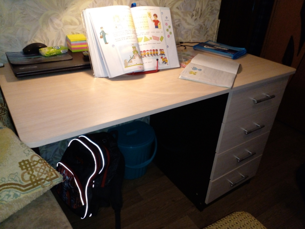 Стол в целом отличный: большой, удобный. Пришел без царапин и сколов. Но ручки на ящиках просто ужас. С двух отпали практически сразу, пока задвигали-выдвигали ящики. На место поставить не смогли- шурупы уже не держали их. Пришлось помудрить)); Достоинства: Большой, хорошо смотрится, удобный; Недостатки: Ручки на ящиках