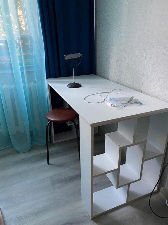Простой белый стол, но невероятно стильный за счёт ножек в виде полочек. Очень довольна.