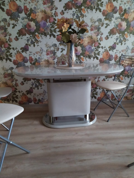 На тяжёлой и устойчивой стальной подставке расположилась ножка с удобно раскладывающейся столешницей, покрытой закаленным стеклом. Установить центральную секцию, чтобы увеличить площадь стола, не составляет труда, благодаря надёжному механизму. Стол, выполненный в стиле модерн, подчеркнет индивидуальность вашей кухни, не перегружая ее лишними деталями.Схема сборки