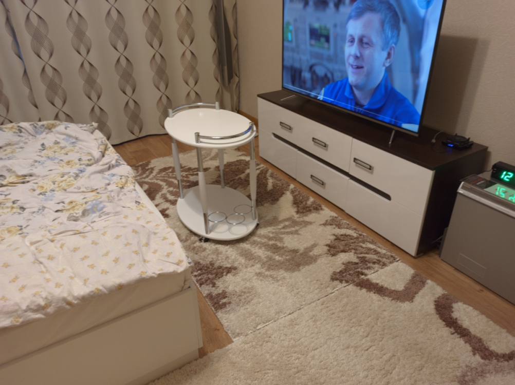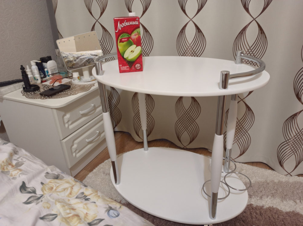 Хорошо вписался в интерьер. Легко собирать - пожилой человек самостоятельно справился. Столик приобретали для мамы, и она даже сама смогла его собрать. В интерьере выглядит очень хорошо. Но есть брак в покрытии и соединении деталей: пятна на покрытии (не стираются, не очищаются), очень грубая сварка (см фото). Подпортило впечатление, думаем о возврате.