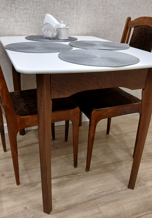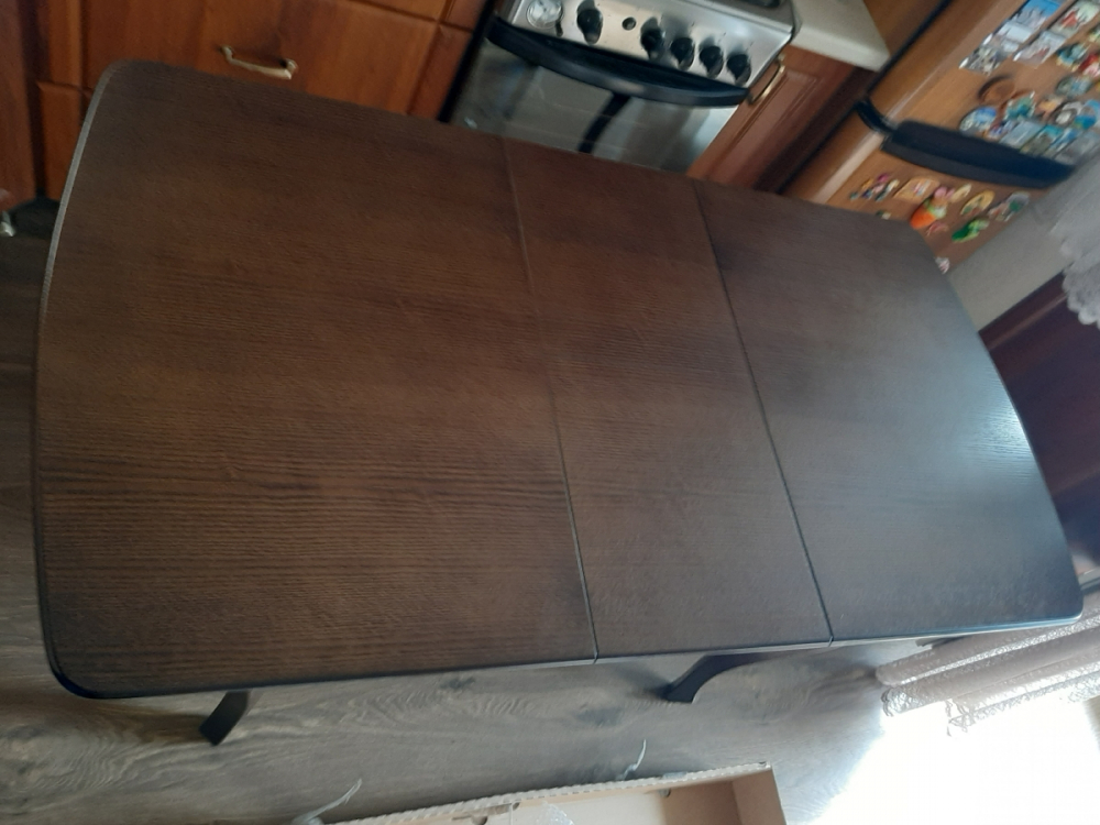 Салфетки 36х36 подошли как раз по размеру. Стол в собранном виде. Когда придут гости, разложить успею. Качество столешницы, ножки стола все на отлично. В моей однокомнатной квартире стало светлее. Теперь надо поменять стулья. Доставка вовремя, цена, качество товара, всё на отлично. Стол 100х70 просто мечта, для пенсионера сейчас мебель купить, дорого. Но здесь не пожалела что купила новый стол. Спасибо продавцу. Ребята вы молодцы.