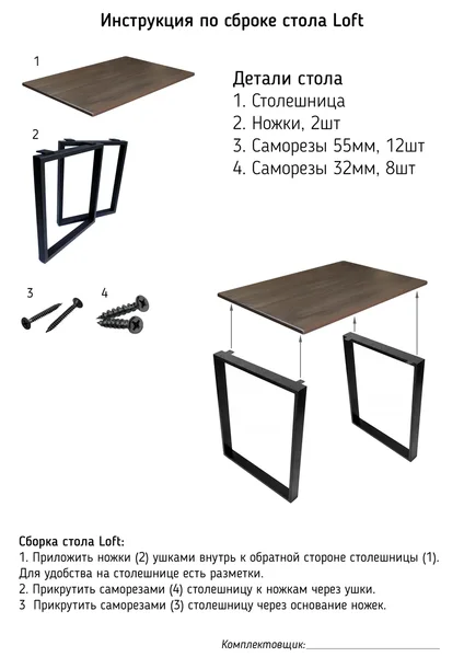 Столешница выполнена из массива сосны (клееный мебельный щит) толщиной 40 мм и покрыта двумя слоями высококачественного древесного лака.Схема сборки