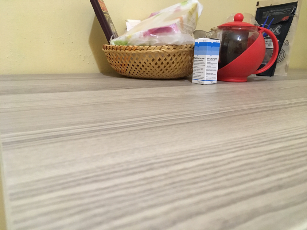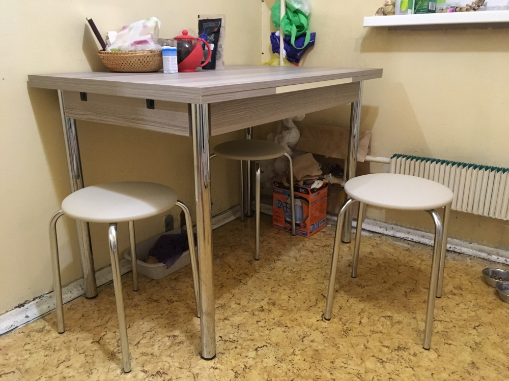 Кухонный стол из ламинированного МДФ. Ножки хром. Две вставки по 30 см с торцов, выдвигаются из-под столешницы.Отзывы