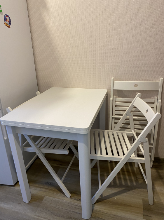 Классный столик! Намного красивее аналогов на хромированных ножках. Для маленькой кухни то, что надо. Собирается элементарно, за 3 минуты, прикрутить ножки и всё. Справится даже ребёнок. Из минусов только то, что столешница непрактичная: шершавенькая поверхность белого цвета… Для сохранения первозданной белизны нужно больше времени и усилий. Было бы лучше, если бы сделали глянцевую поверхность или хотя бы не такую фактурную. Даже ножки более гладкие у этого стола. Подумываю накрыть всё же стеклом.