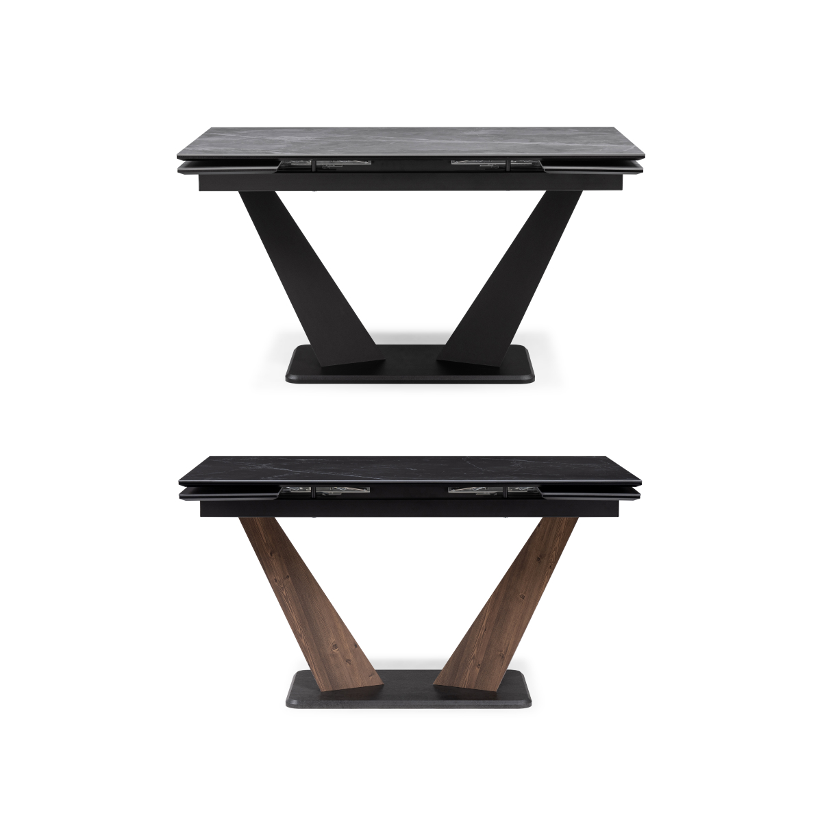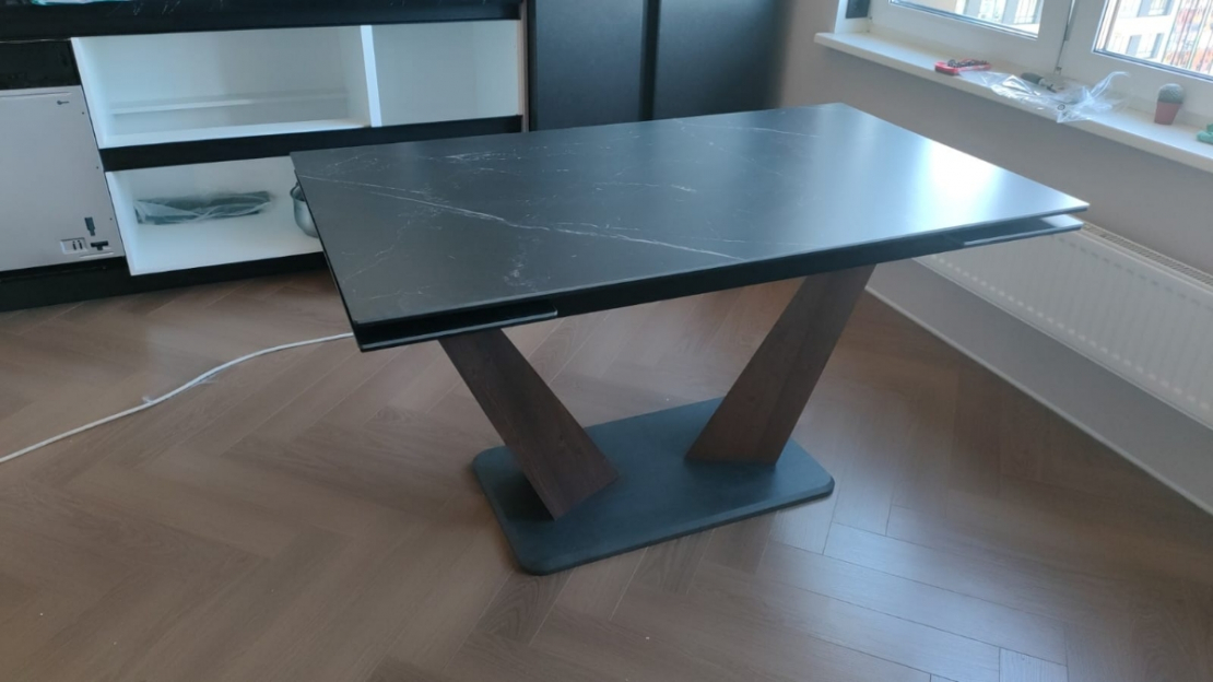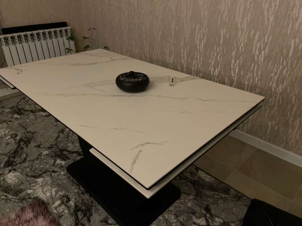 Классный стол. Устойчивый, основательный. Качественный механизм раскладывания. Хорошие материалы- керамогранит на столешнице и шпонированные ножки. Единственное немного выбивается белая подставка.