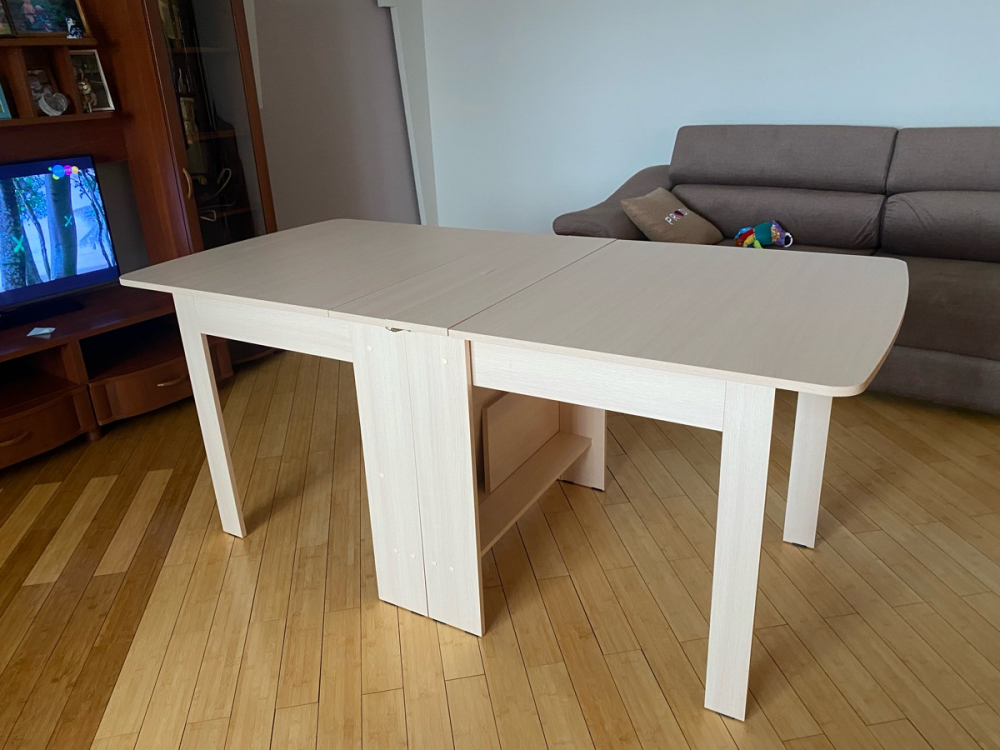 нам нужен был стол для застольев,но при этом чтобы не занимал много места в квартире. так как у нас большое уоличество гостей ,мы искали максимально длинный стол. наткнулись на данный товар у этого продавца, просмотрели видео и фото тех кто уже приобрел. после неоднозначных отзывов таки решили заказать и убедиться на себе какой он. приехал в двух коробках ,вес около 25-30кг (не помню точно) курьер заранее позвонил,привез,поднял на этаж,занес домой.начали собирать, в целом потратили не так много времени на сборку ,но как и писали, ушло около 3ч. не хватило каких то двух деталей,(шурупиков) муж докупал. с остальным нареканий нет. в коробке присутствовала инструкция. застолье выдержал отлично, уместил и яства и гостей. складывается и раскладывается легко. мы довольны. если кто то недоволен качеством , а там, не сказала бы что толстая, но и не такие тонкая по ширине поверхность стола, то учитывайте для каких целей вы его берете.мы брали для праздников, у нас все отлично, пришел без сколов,без вмятин, отлично упакованный и качественный стол. спасибо за продукцию. не успела сфотографировать готовый, попозже если получится добавлю.; Достоинства: компактный на большое застолье, чтобы всем удобно было