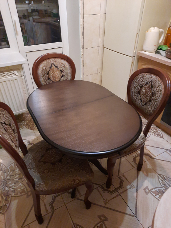 стол отлично вписался в интерьер, выбирали по дизайну и размер подошел идеально на маленькую кухню, семья из 4 человек вполне помещается за ним. а если гости зашли, можно раздвинуть. покупкой довольна, стол хороший.