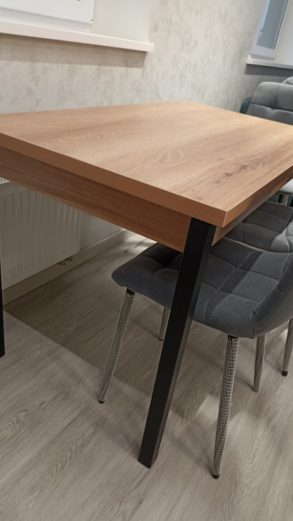 Достоинства: Хороший стол, устойчивый, железные ножки , красивый , цельная столешница, легко раскладывается , нравится что столешница толстая поэтому смотрится благородно и стильно, доставили в срок , занесли в квартиру . Собрали за 5 минут , нужно только прикрутить ножки. Надеюсь столешница влагостойкая ); Недостатки: не угодала по цвету он с рыжим отливом