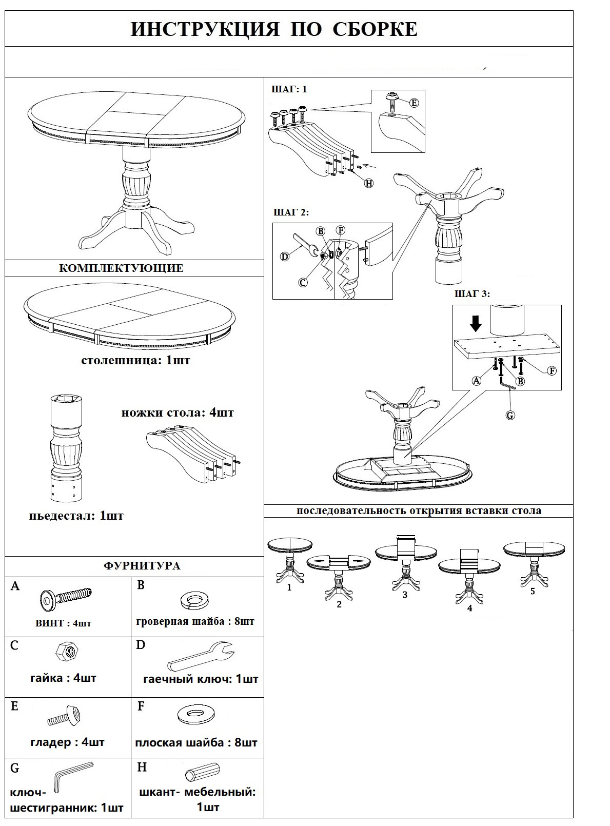 Достаточно раздвинуть края столешницы, достать центральную вставку, раскрыть ее и сдвинуть края.