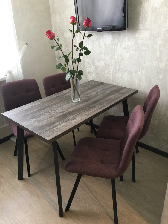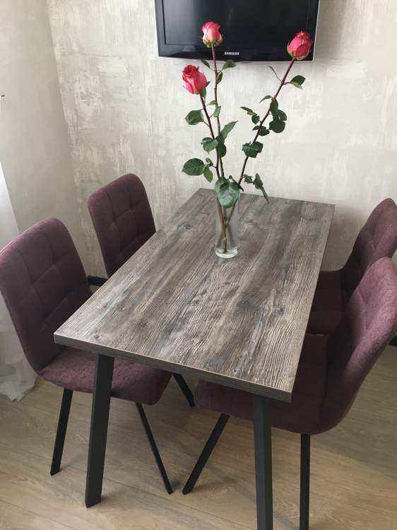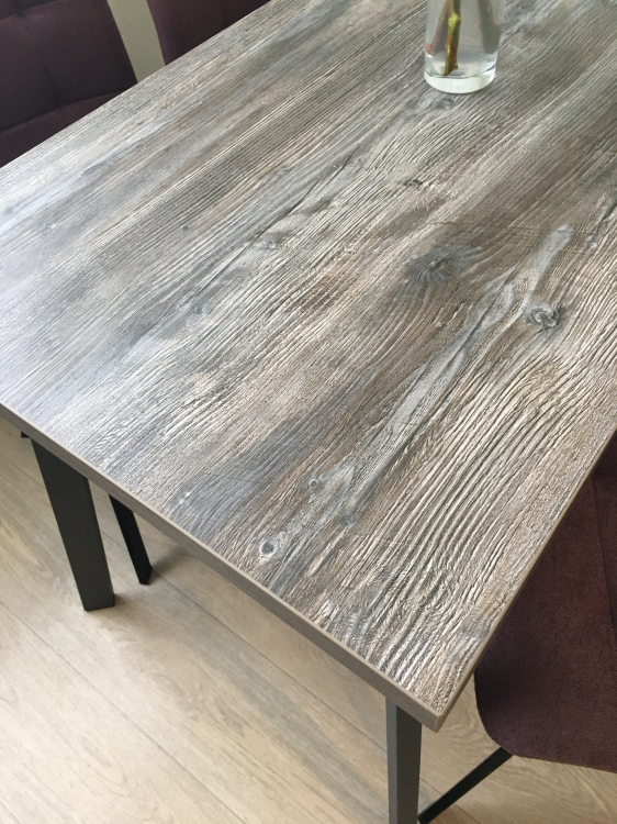Стол очень понравился. Цвет как на фото, есть и серые и коричневые и бежевые оттенки, и даже где-то серо-голубые. Искала именно такое сочетание цветов, подошел идеально. Устойчивый. Текстура столешницы ребристая, не гладкая.