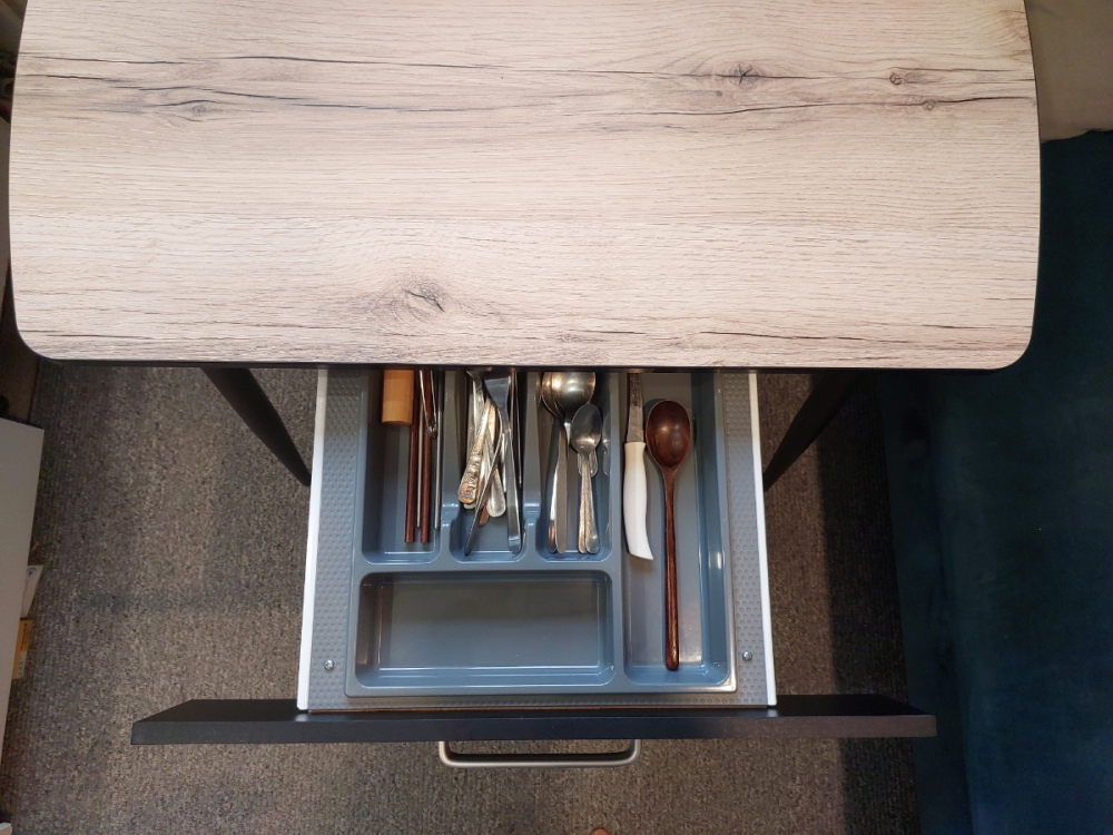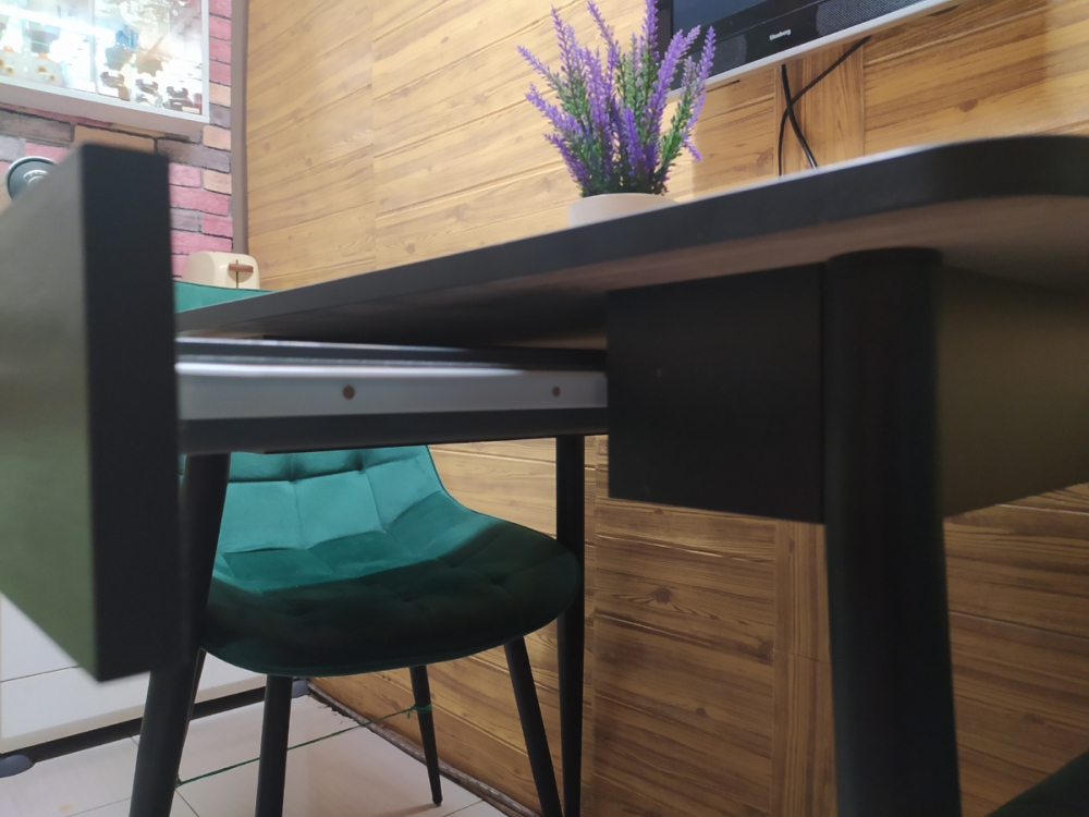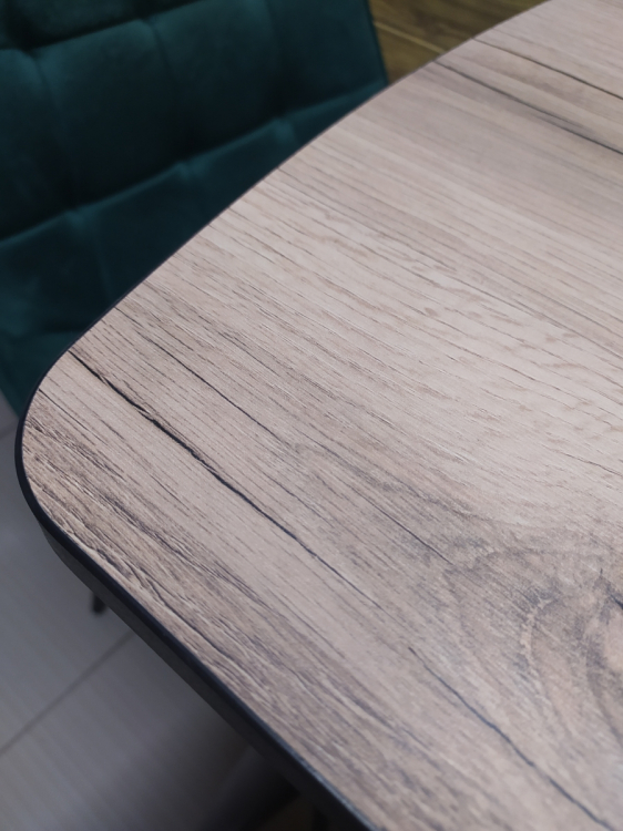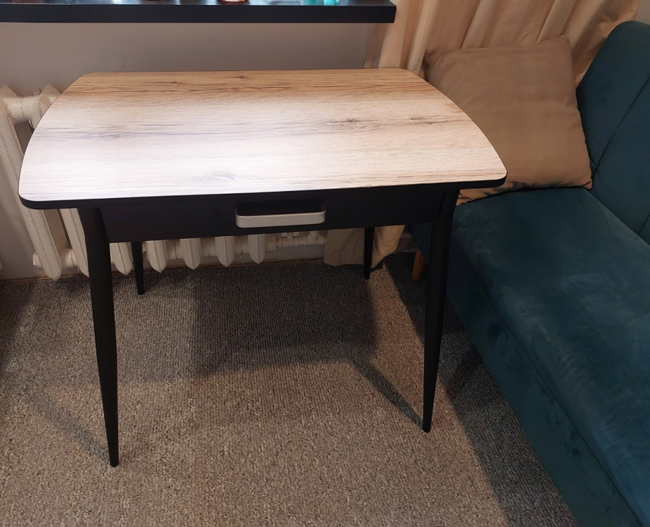 Прекрасный стол. Идеальный вариант для небольшой кухни. Пришёл через компанию по доставке ПЭК. Пришлось ехать на край города и везти домой на такси. Но стол того стоил). Был упакован в две коробки (ножки отдельно). Стол был в собранном виде, только прикрутить ножки. Устойчивый. Ножки без повреждений, имеют пластиковые полукруглые подпятники. Поскольку ножки стола имеют не прямую, а слегка изогнутую форму, поставить стол вплотную к стене не получится, остаётся зазор в 7 см. Но для меня это скорее плюс, чем минус. Интереснее смотрится. Ящик на роликовых направляющих, выдвигается бесшумно, не шатается. Внутри ящика пластиковый лоток, зафиксированный с одной стороны на пару болтов. При желании можно вынуть (удобно, если нужно будет помыть). Ручка ящика из толстого пластика серого цвета. Расстояние между ножками по длинной стороне: от пола 78 см, по середине около 69 см, в верхней части 62,5 см. Расстояние между ножками по короткой стороне соответственно 62 см, 52 см, 44 см. Высота стола 76 см с учётом толщины столешницы, толщина которой 1,6 см. Цвет столешницы чуть светлее,чем классический дуб вотан. Но это на мой субъективный взгляд. В целом очень доволен приобретением. Стол стал украшением кухни! Рекомендую