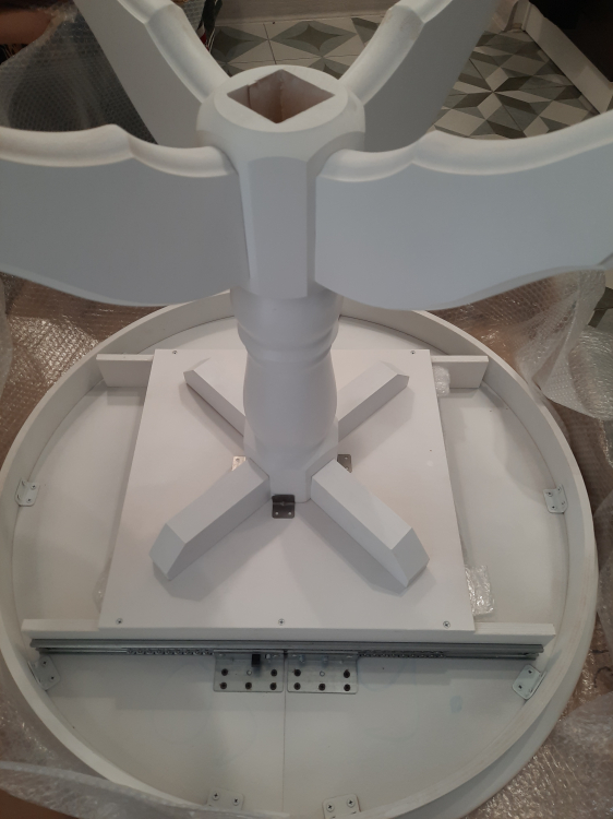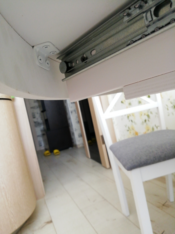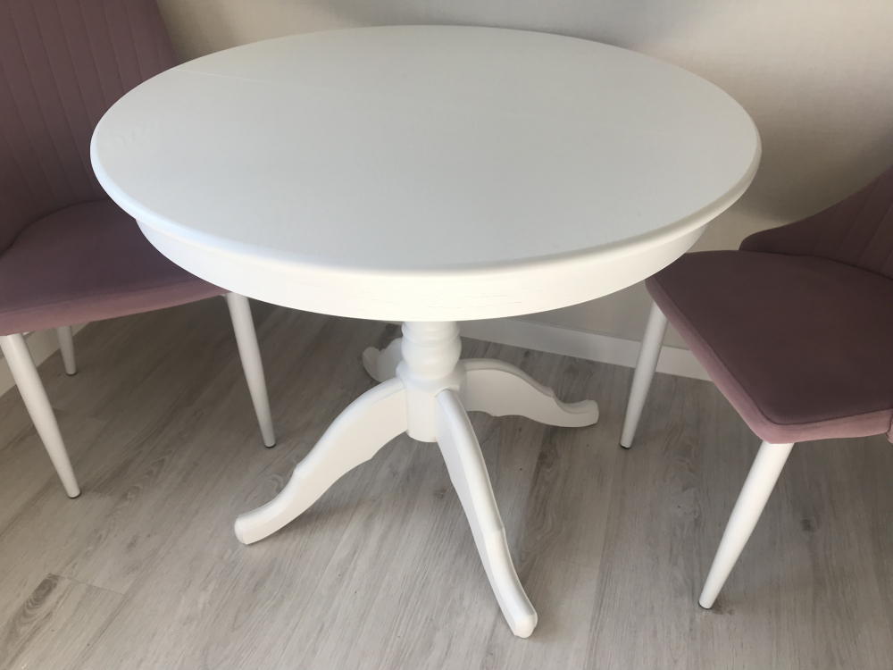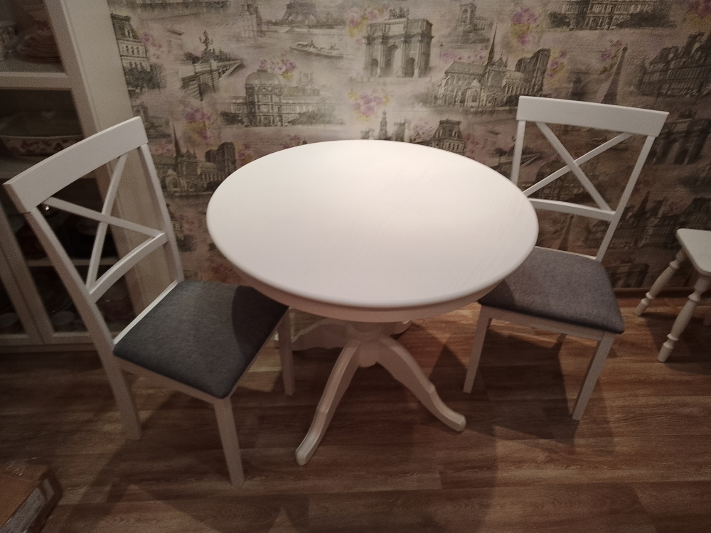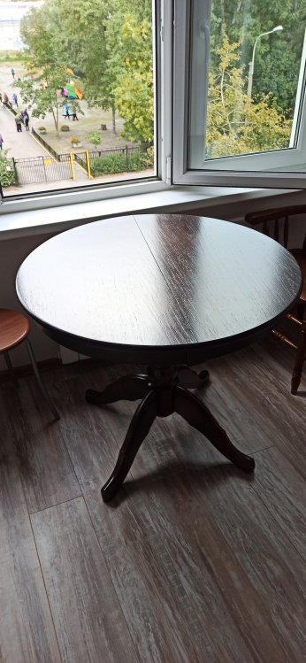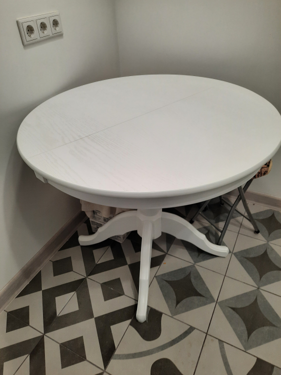 Хороший, добротный стол. Искали круглый белый раздвижной стол по адекватной цене, остановились на этом варианте. Столешница шпон с фактурой дерева. Нога массив дерева, но очень мягкого, будут оставаться следы, при неаккуратном обращении. Нам привезли в срок, однако не хватало фурнитуры, а коробка с ногой была вскрыта, курьер сам дополнил фурнитуру. Минус не было инструкции по сборке, в итоге пришлось запрашивать у продавца, пока ждали, начали сборку, в итоге собрали неверно, придётся переделывать. В целом - стол хороший.