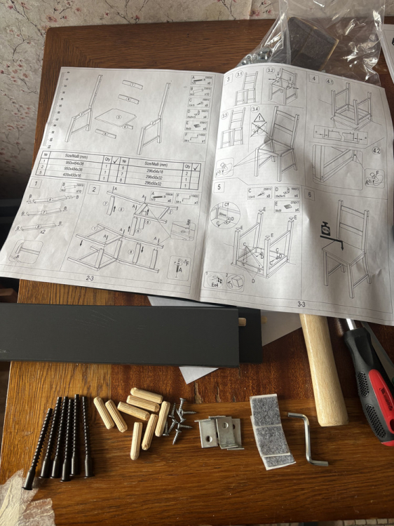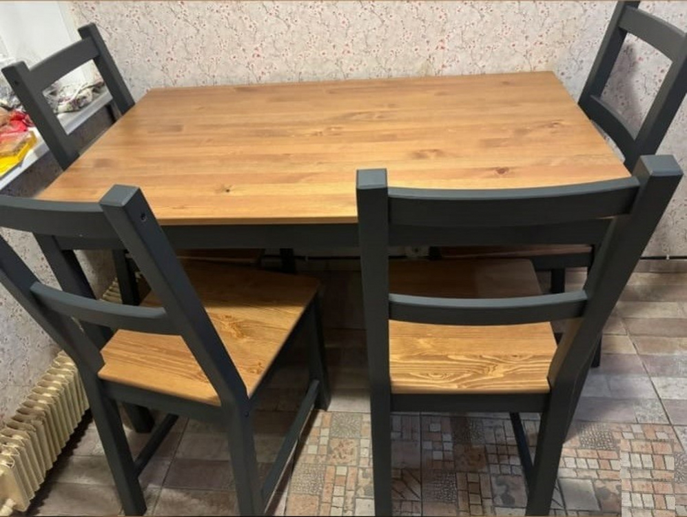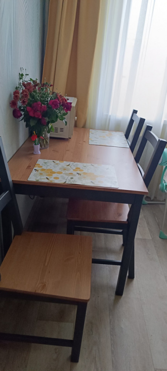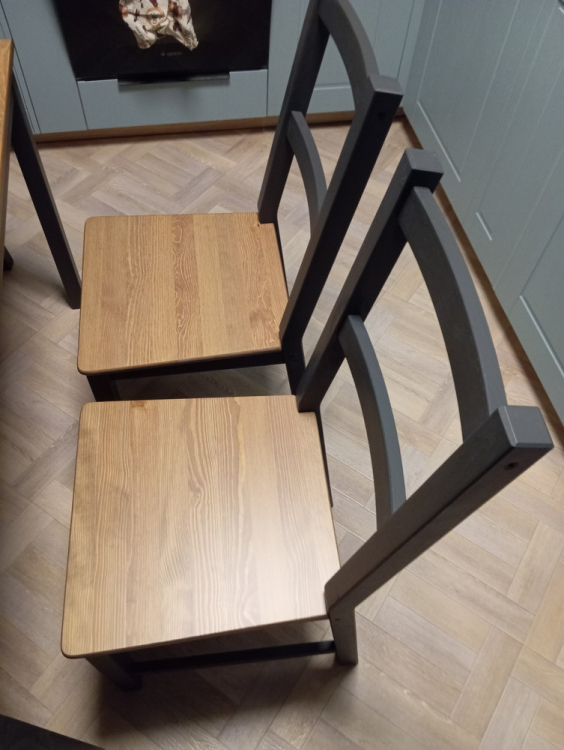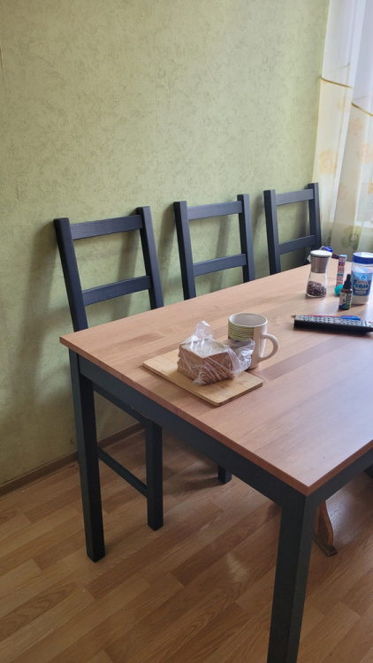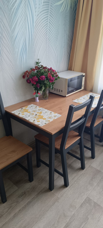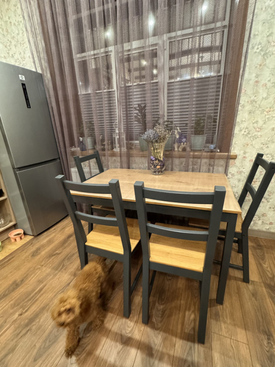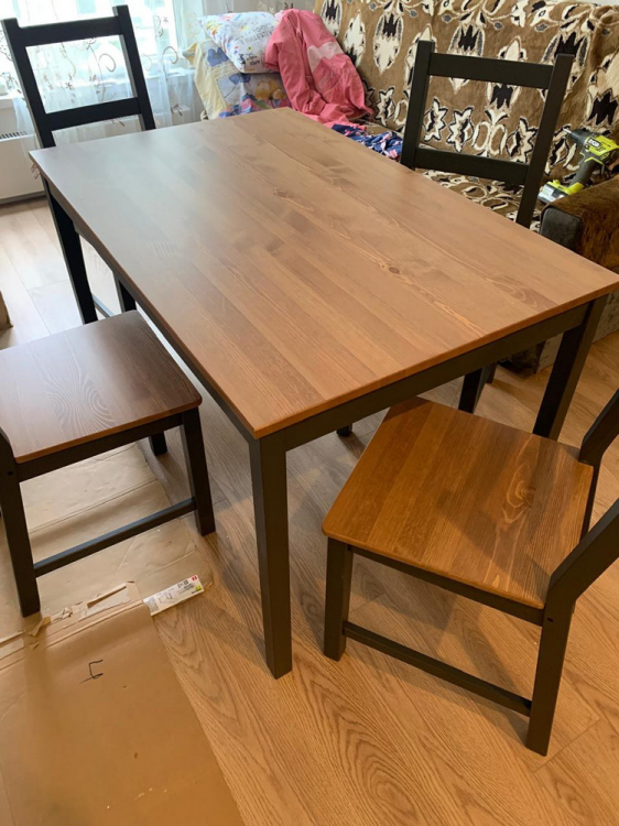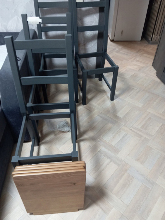 Хороший комплект, собирается легко. Комплектующие для сборки по пакетам, что оказалось очень удобно (один стул - один пакет). Комплект показался очень лёгким, даже невесомым. Посмотрим сколько прослужит Лёгкость сборки, быстрая доставка Недостатки: Столешница не единым полотном, а из спущенного массива.