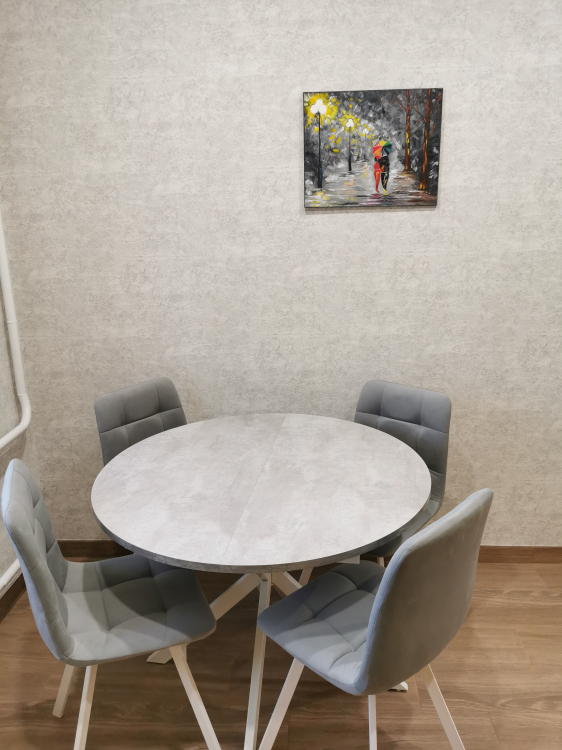 Стол супер, крепкий, красивый, современный, а главное колени ни во что не упираются и не бьёшься ими о ножки. 4 стула не крупных за ним хороши. Если хочется не стулья, а кресла, то не более 3х рекомендую.