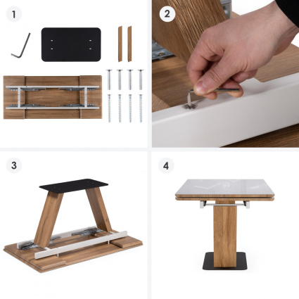 2. Переверните столешницу и прикрутите к ней две ножки с помощью фурнитуры.