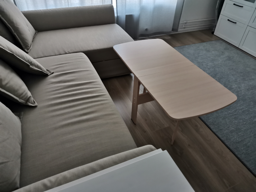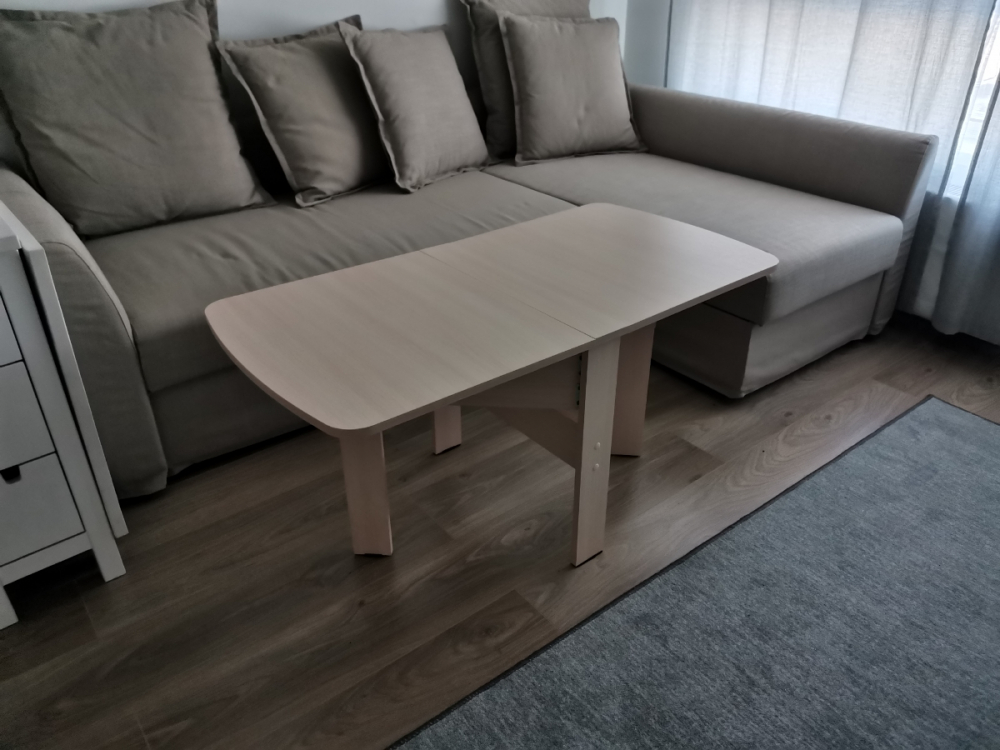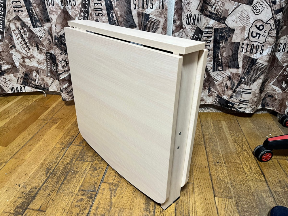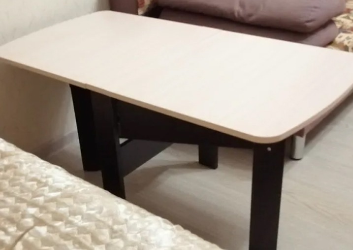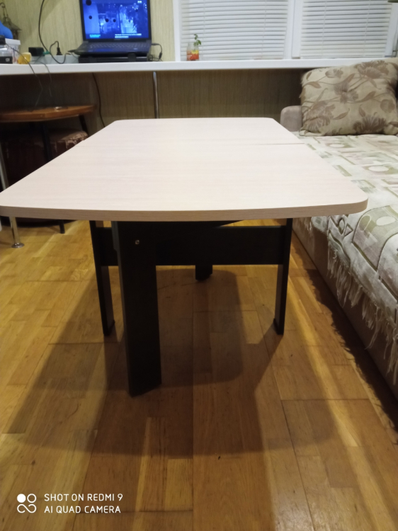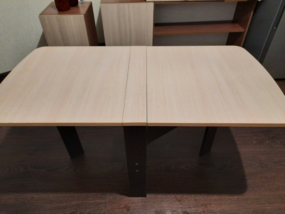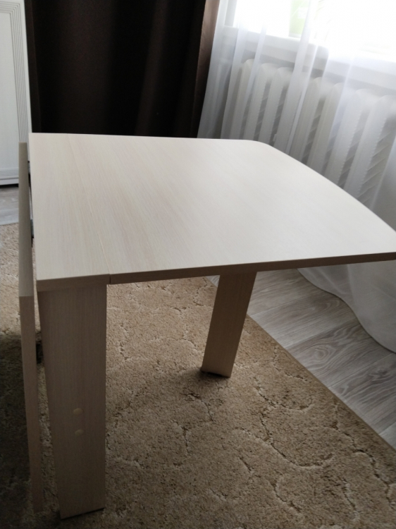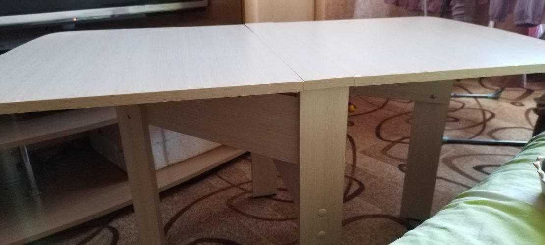 Удобный компактный стол. Любим обедать в зале всей семьей (4 человека) и этот стол для нас спасение.Можно разложить одну половинку и уместиться втроем.Для большой компании из 8 человек подходит отлично. Легко раскладывается и складывается.; Достоинства: компактный, удобный; Недостатки: не нашла