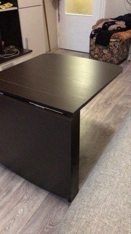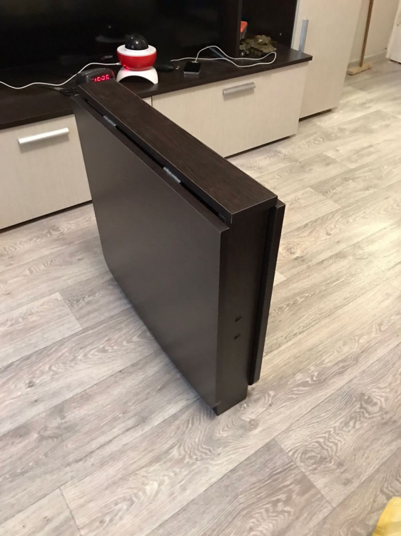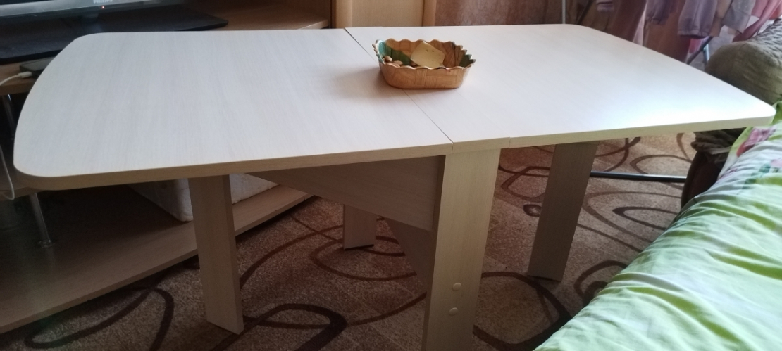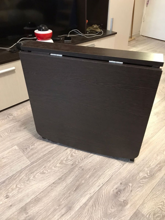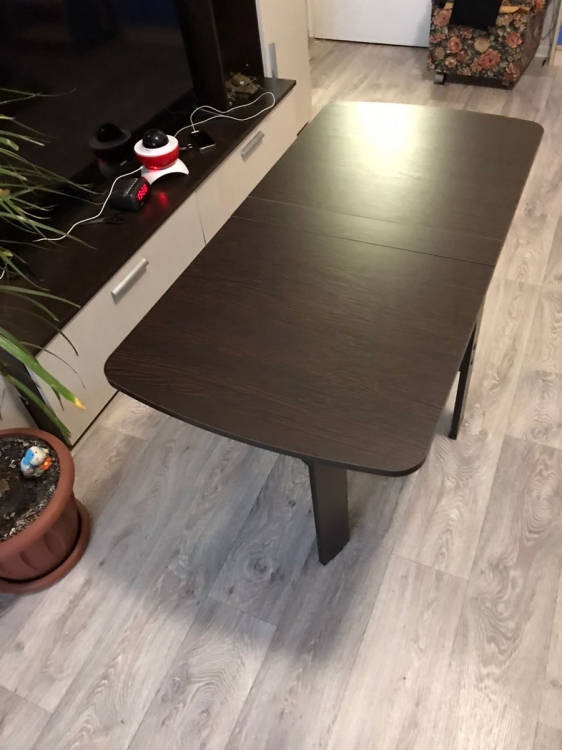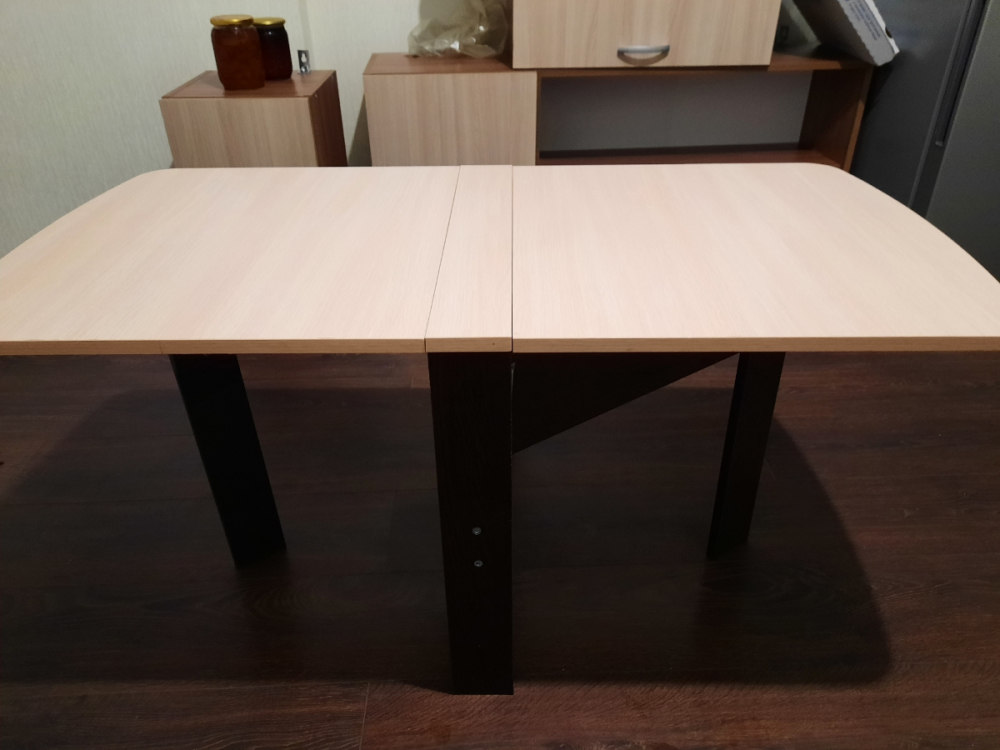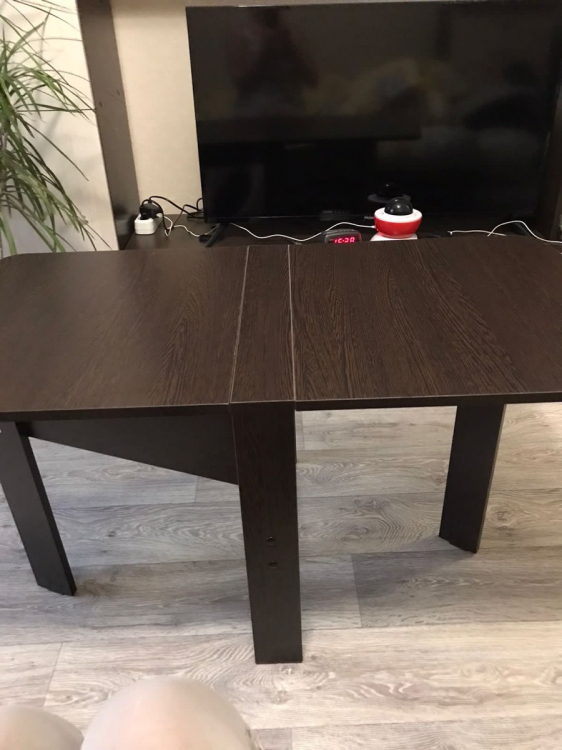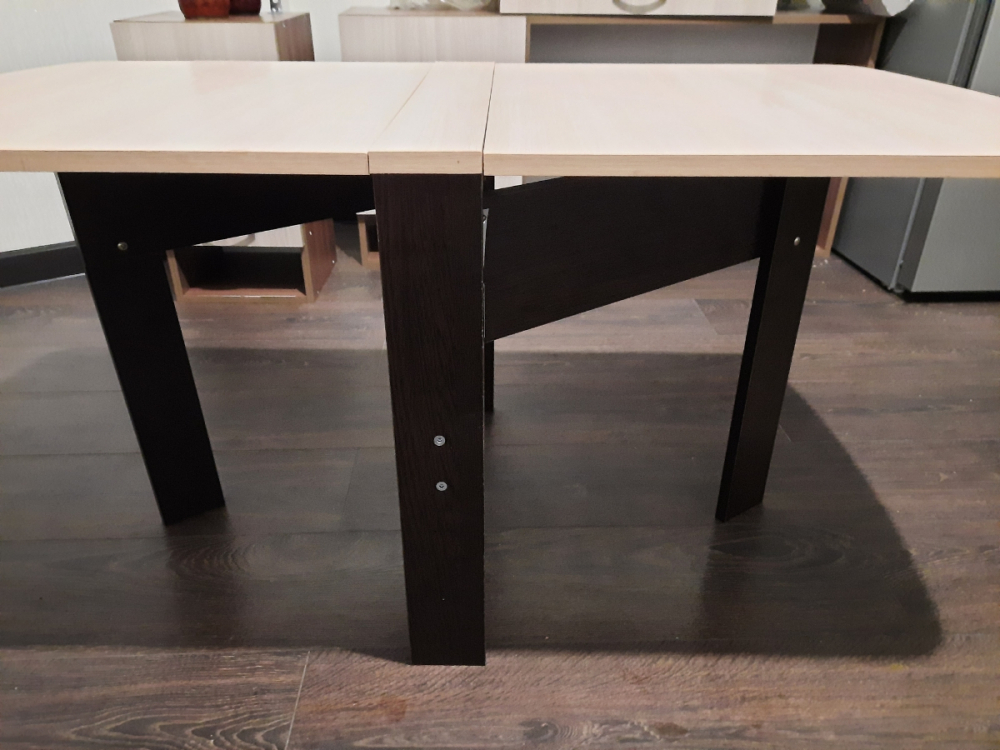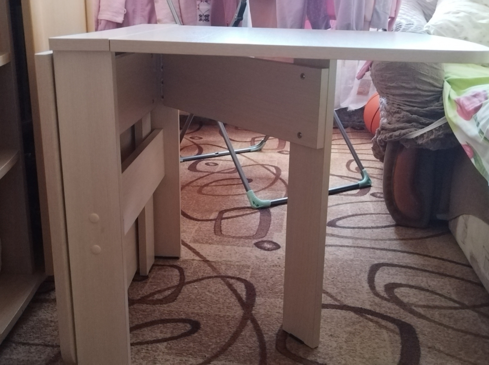Удобный компактный стол. Любим обедать в зале всей семьей (4 человека) и этот стол для нас спасение.Можно разложить одну половинку и уместиться втроем.Для большой компании из 8 человек подходит отлично. Легко раскладывается и складывается.; Достоинства: компактный, удобный; Недостатки: не нашла