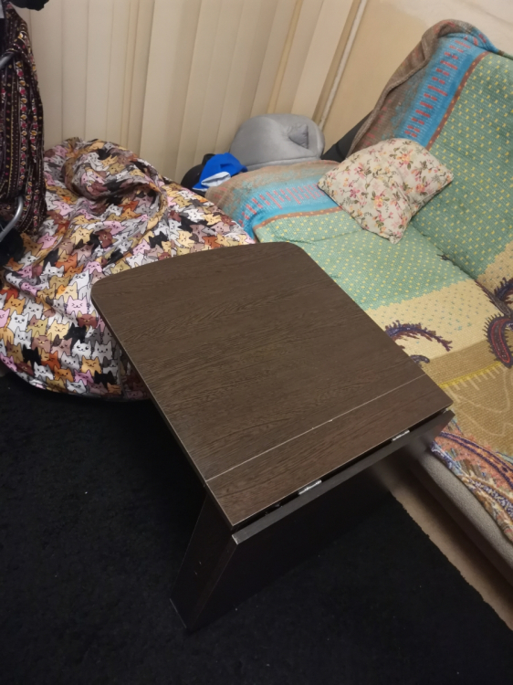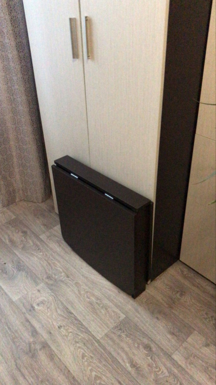 Очень компактный журнальный столик, за шкаф ставишь и даже не видно его. Маленький нюанс в том, что в сложенном виде он не очень устойчивый, но это не проблема) полностью оправдал ожидания! Соответствует размерам указанным в описании.; Достоинства: Компактный; Недостатки: Не очень устойчивый