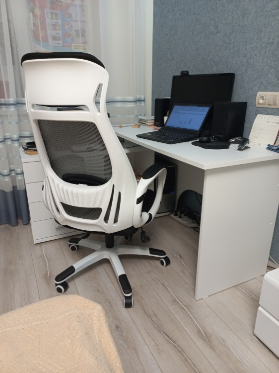 Кресло понравилось как по внешнему виду, так и по удобству. Несмотря на материал с дырочками, сидеть - жарко. Плюсы: режим качания. Легко поворачивается и передвигается по полу. Недостаток в доставке конкретного кресла: царапина на ножке. Так как коробку с креслом распаковали только через неделю, возврат смысла делать не было.; Достоинства: Удобно и комфортно; Недостатки: Царапина на ножке стула, недостаток контроля качества