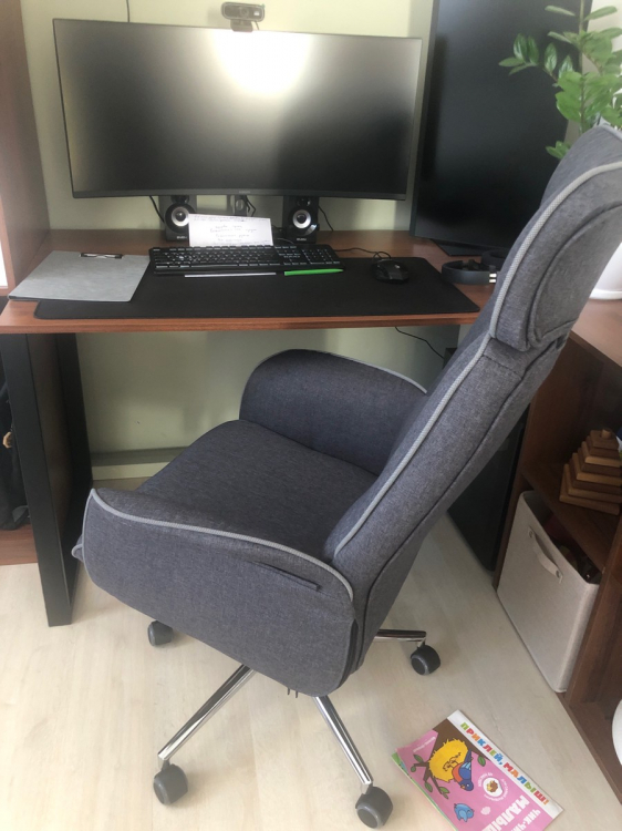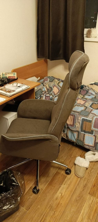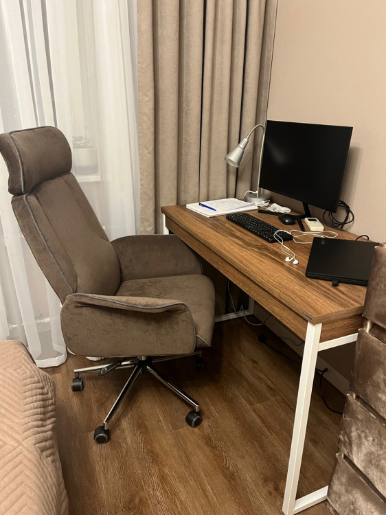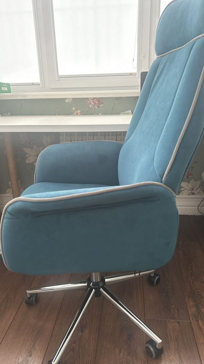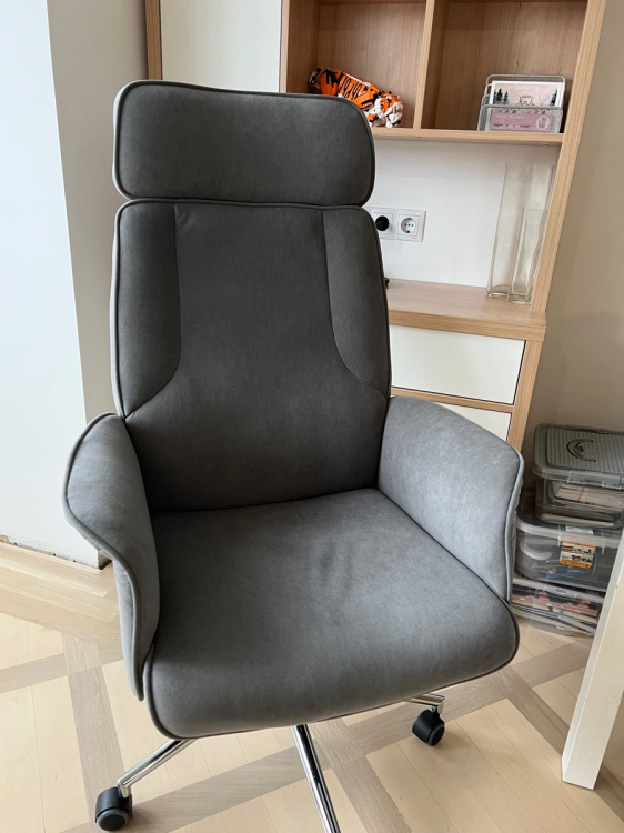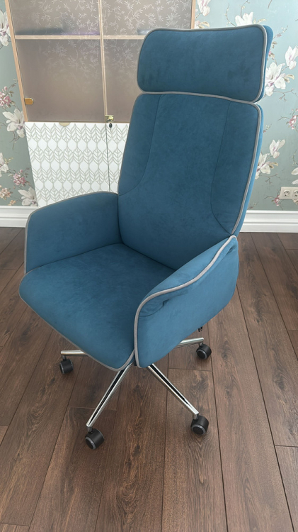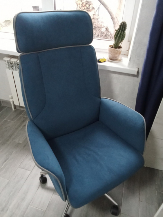 Обивка кресла выполнена из флока.Убодная высокая спинка, можно откинуть голову. Не смотрятся громоздко , аккуратные. Все застегнулось, завернулось, привинтилось, будеи смотреть в эксплуатации. Колеса для ламината подходят. Цвет соответствует. Сборка не молжная по видео инструкции. Комплектность полная Недостатки: Пока нет