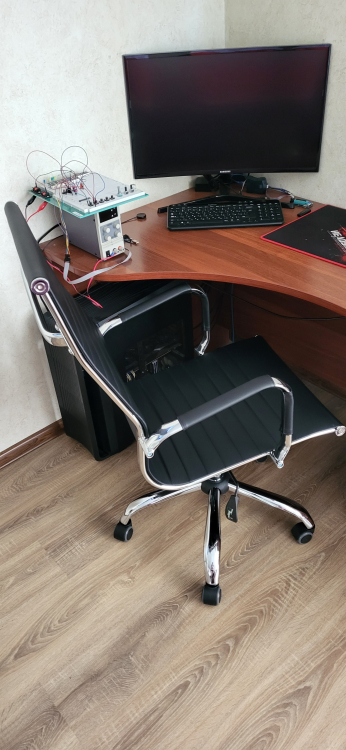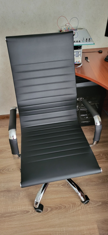 Материал обивки: экокожа.Отличный стул вставать не хочется. Эргономичный, стильный, приятные материалы, не мягкий но и не жёсткий (думал будет жёстче). Из недостатков: колёсики как по мне не прорезиненные заказал на али новые, ну и ручка на спинке одно время раздражало из за щели между ней и дышлом кресла постоянно непроизвольно пальцы лезли, да и цвет я думаю коричневый по приятней будет сразу не заметил выбрал бы его.
