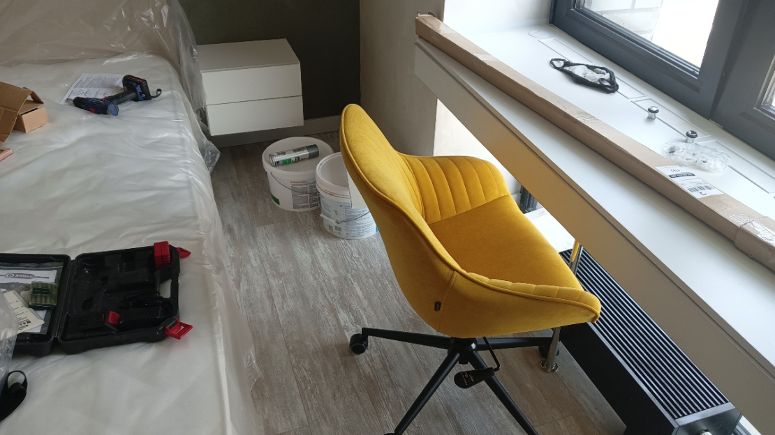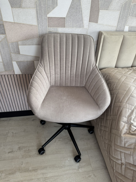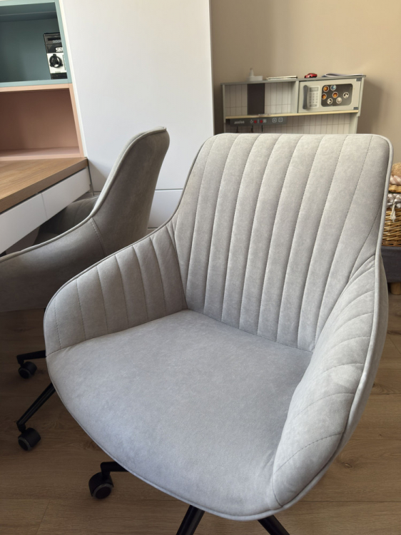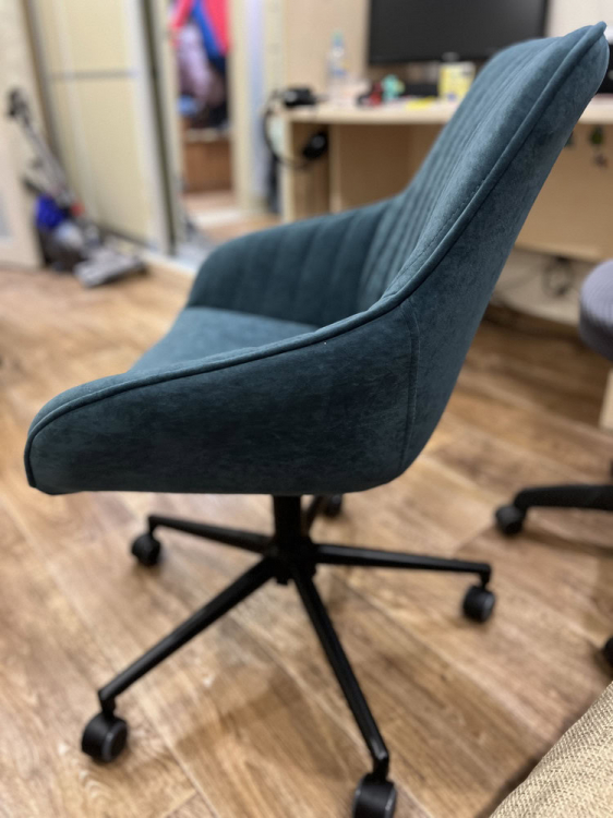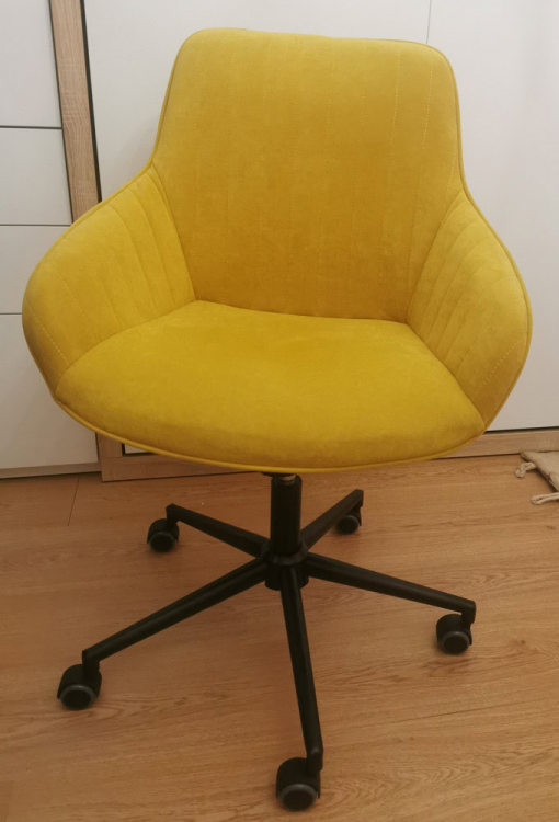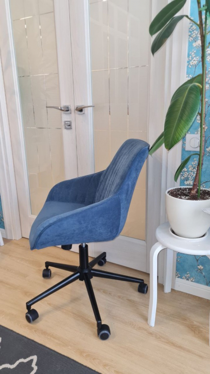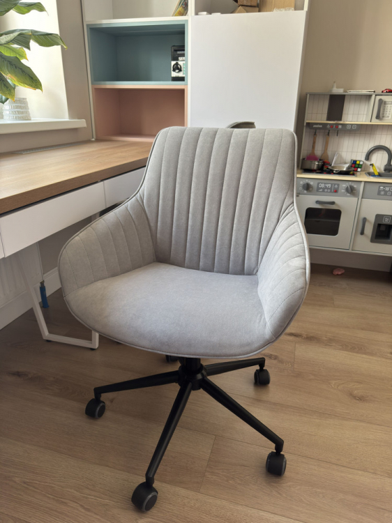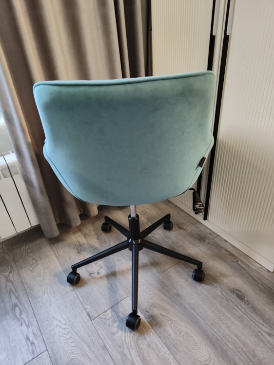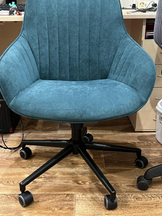 Купил это кресло как рабочее для работы за компьютером в спальне. Доставили за два дня. Огромная коробка, все прекрасно упаковано, кресло очень легкое. Сборка заняла меньше 10 минут с выносом мусора :) Нужно открутить-прикрутить 4 болта, вставить колесики и патрон. Ткань кресла - по типу флока, мне кажется, она должна быть очень долговечной. Регулируется по высоте и наклону сидения. Есть регулировка усилия для качания, а также фиксатор позиции. Катится по полу мягко.