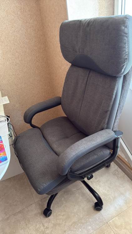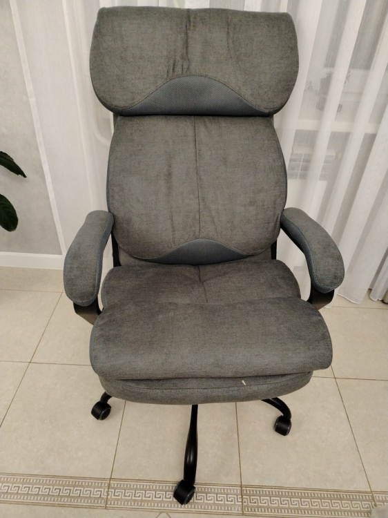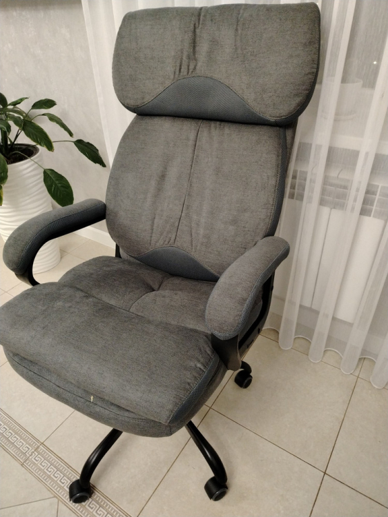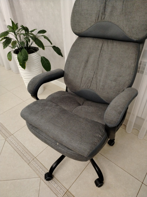 Кресло очень мягкое и большое, есть возможность зафиксировать спинку в удобном положении и задать диапазон, в котором спинка может качаться. Ортопедическая спинка и удобное сиденье. Ножки пластмассовые, но достаточно добротные, колесики прорезиненные, катается по полу мягко и бесшумно. Собирается достаточно легко при помощи одной крестовой отвертки. Обивка приятная ткань со вставками из темно-коричневой сетки, цвет в реальности соответствует фото. Выбирали обивку из ткани т.к. дома есть кот, в случае зацепок очень легко устранить иголкой. Очень рекомендую.