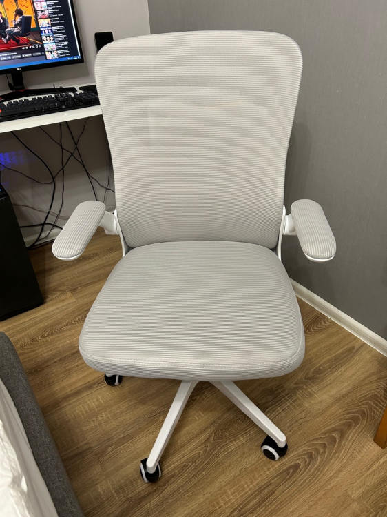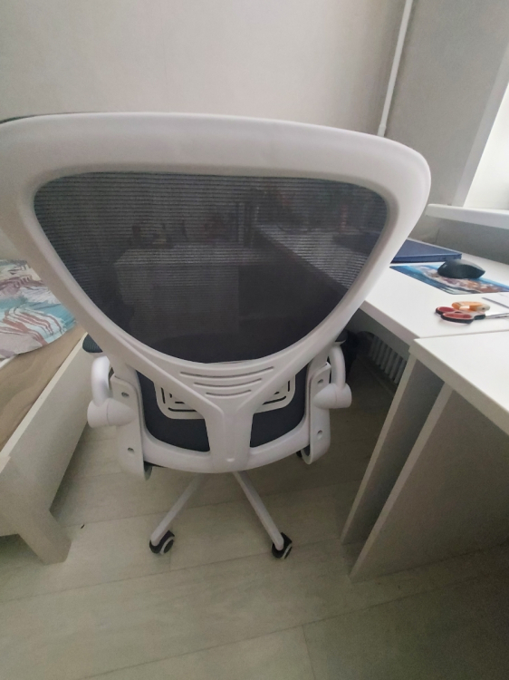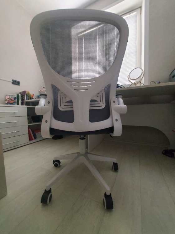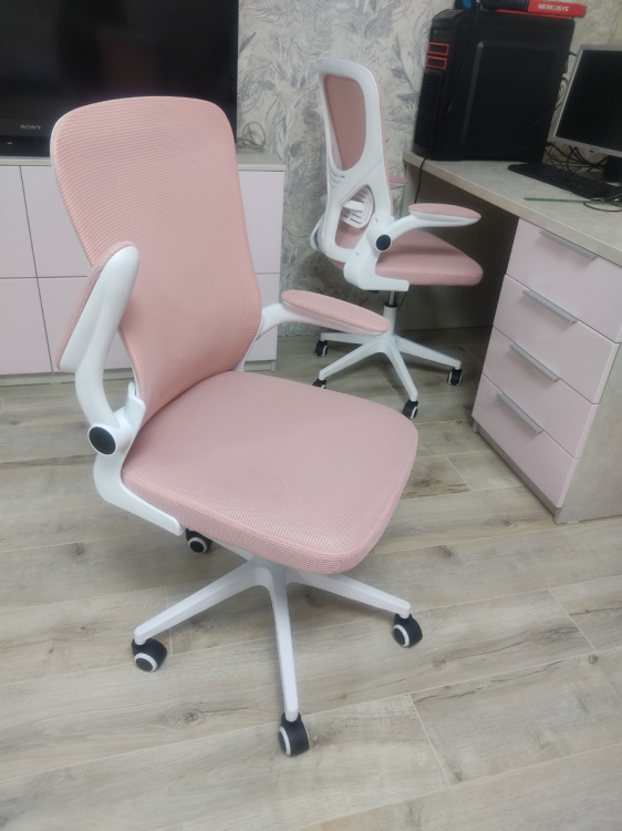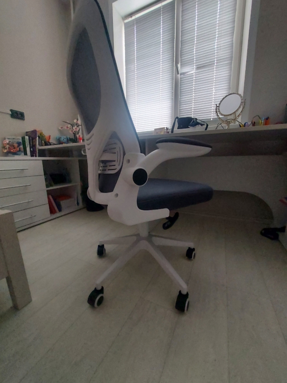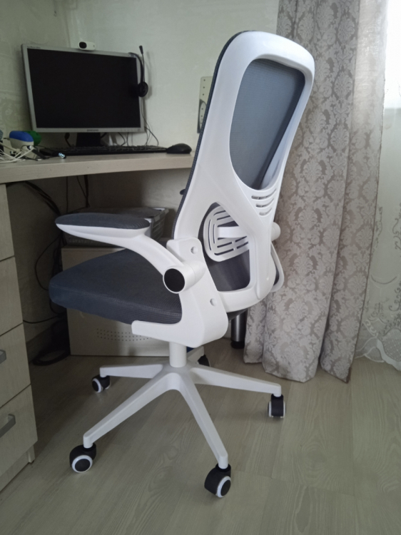 Кресло оснащено откидными подлокотниками.Достоинства: Удобное, хорошо вписывается в интерьер. Брали мужу, он очень доволен. Собрал легко, правда в первый раз не до конца закрепил болты на ножке и кресло неприятно скрипело. Когда поняли, в чем дело - подкрутили и стало отлично) Ручки кресла при желании можно поднять.; Недостатки: Меня немного покоробило то, что пластик колес был не однородный по цвету. Видимо, что-то не так было с хранением на складе - с одной стороны часть колесиков была желтоватая. Но для нас это не очень критично, разве что первое впечатление подпортило.