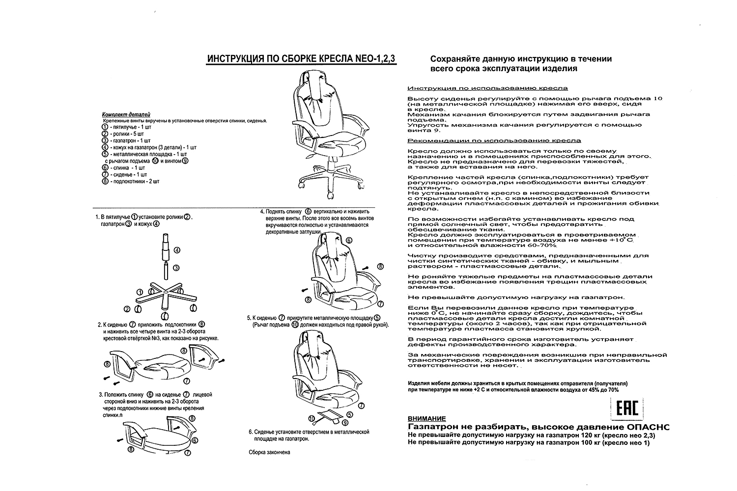 Добротное кресло, крепкое, удобное. Собирать лучше мужчине. Пока собирала, чуть спину не сорвала (а я не слабая), нужна сила. Совет: читайте инструкцию, нужна большая отвертка, номер указан в инструкции.