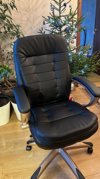 Кресло в итоге оставили себе, нам нравится.Пятнистость вообще не заметна. По цвету нам очень подошло к мебели; Достоинства: Хорошее, добротное кресло.Довольно жесткое для сиденья.Держит спину. Есть возможность качаться, механизм топган.; Недостатки: Не знаю счить это недостатком или нет, но именно мой цвет - brown имеет пятнистость, как сказал продавец- под старину. Если смотреть очень внимательно на фото от продавца, вы поймете о чем я.