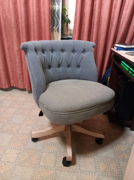 Хорошее кресло. Мягкое, уютное. Цвет нейтральный: серо-голубой. Мне нравится. Забираюсь в него с ногами. Если как рабочее - то наверное надо подушечку под спину, чтобы поясницу держало. А как домашнее - так хорошо.