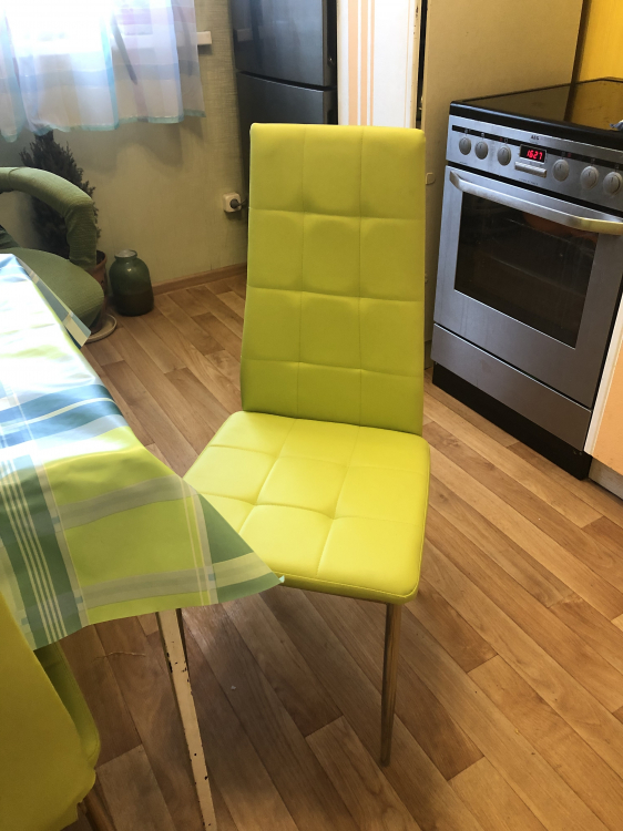 Стулья как на фото,красиво и ярко смотрятся,сидеть удобно,спинка под прямым углом,развалиться не получится,только сидеть ровно. Каркас стула железный и идёт на спинке по периметру,а Середина пустая,обивка спинки мягкая и надета сверху на каркас,и получается,что середина спинки мягкая. Кошачьи когти остаются моментально,своего кота я чуть не убила:)