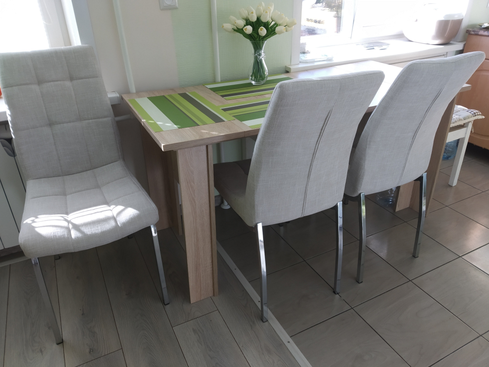 Рекомендую эти стулья! Цвет - более серый, я бы назвала молочный, не соответствует цвету на сайте. Собираются легко, пришли в одной громадной коробке 3 стула. Ткань напоминает лён или грубое плетение бязи, ткань натянута и прошита прочно, не будет съезжать. На первый взгляд огорчило, что они уж очень жесткие, но прошло 2 недели с момента доставки и стулья стали мягче, сидеть комфортно, так даже лучше, наполнитель не продавится со временем и будут выглядеть, как новые, еще долго. Держателям кошек совет - готовьте покрывала, чтобы накрывать их)) Моя кошка влюбилась в стулья из-за грубой ткани, коготки дерет о них играючи, прыгая со спинки на сидушку, затяжки практически не видны, но все же остаются. За эту цену сложно найти более современный дизайн с хорошим качеством! Я до сих пор ими не налюбуюсь! Берите, не пожалеете!