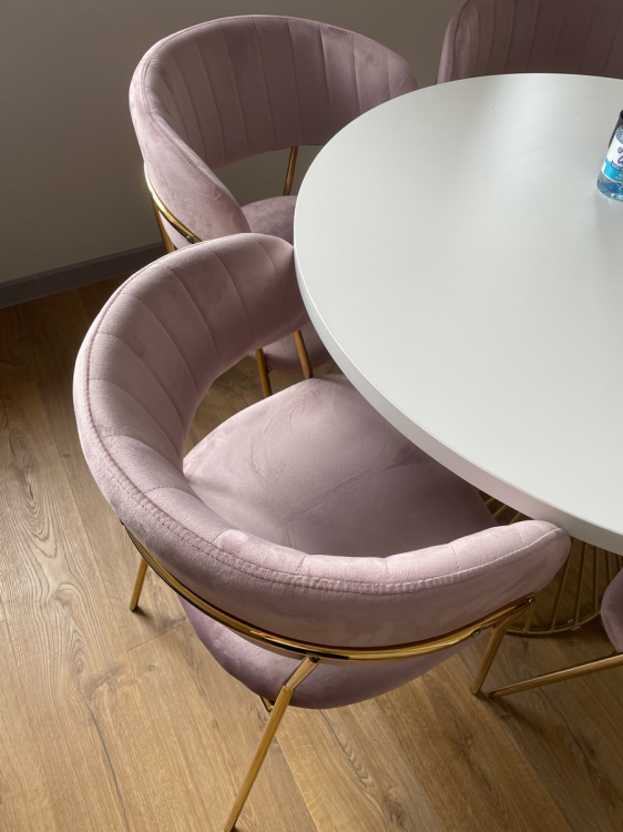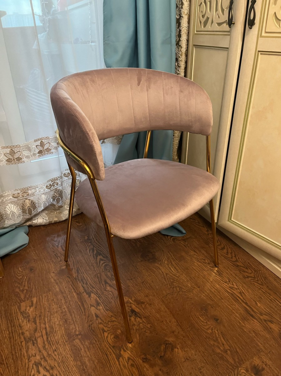 Очень сложно было найти стулья с золотыми ножками. Эти устроили по цене и качеству. Упакованы хорошо. За круглый стол 1 метр спокойно помещаются 5 штук в задвинутом виде и 6-7 в отодвинутом.; Достоинства: Мягкие, красивые, удобные; Недостатки: Есть нюансы в отделке спинки